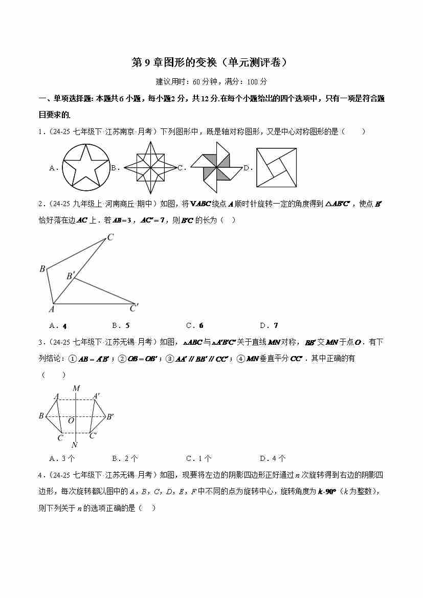 【苏科版】七年级数学下册-第9章:图形的变换(单元测评卷)(原卷版)