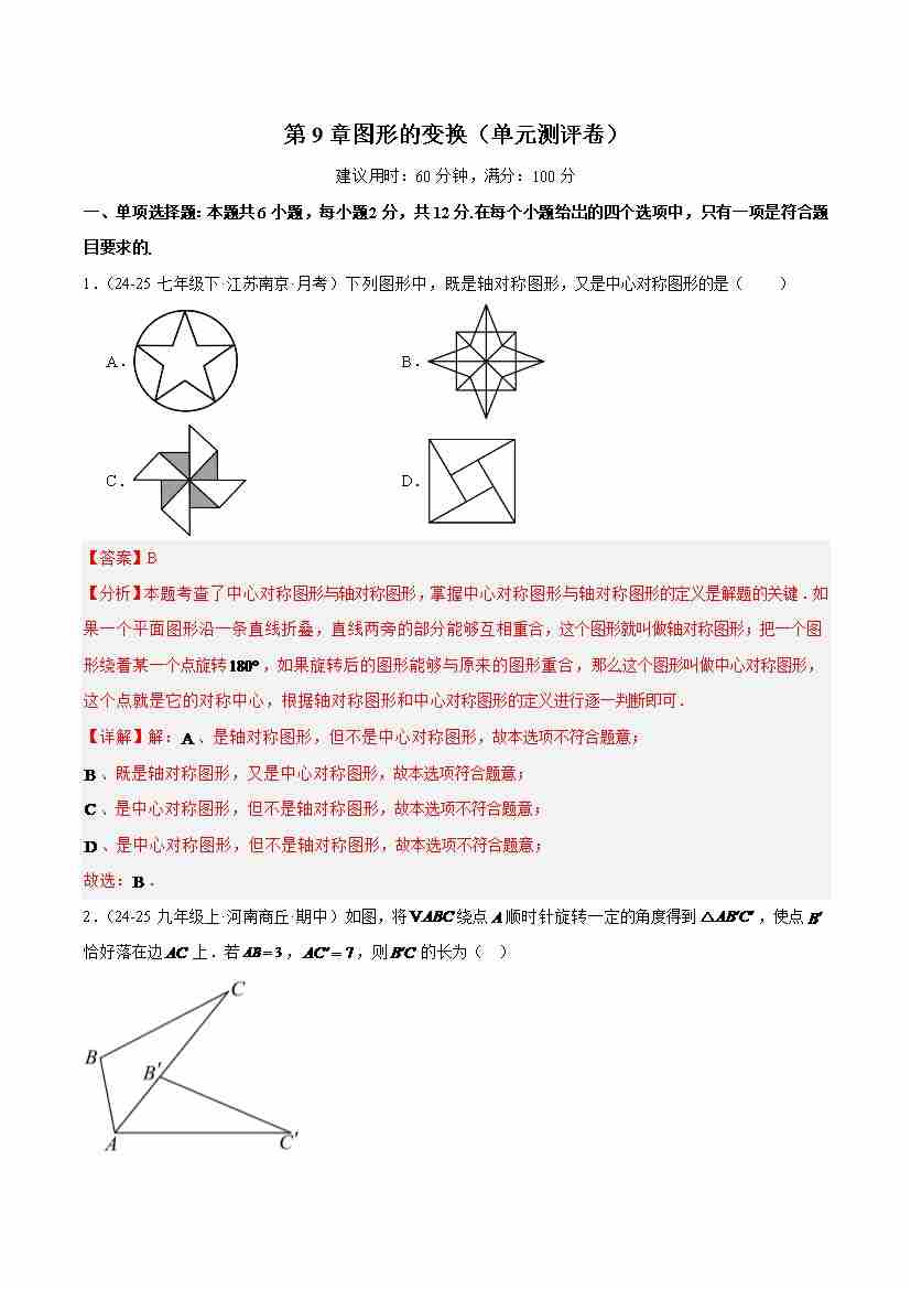 【苏科版】七年级数学下册-第9章:图形的变换(单元测评卷)(解析版)