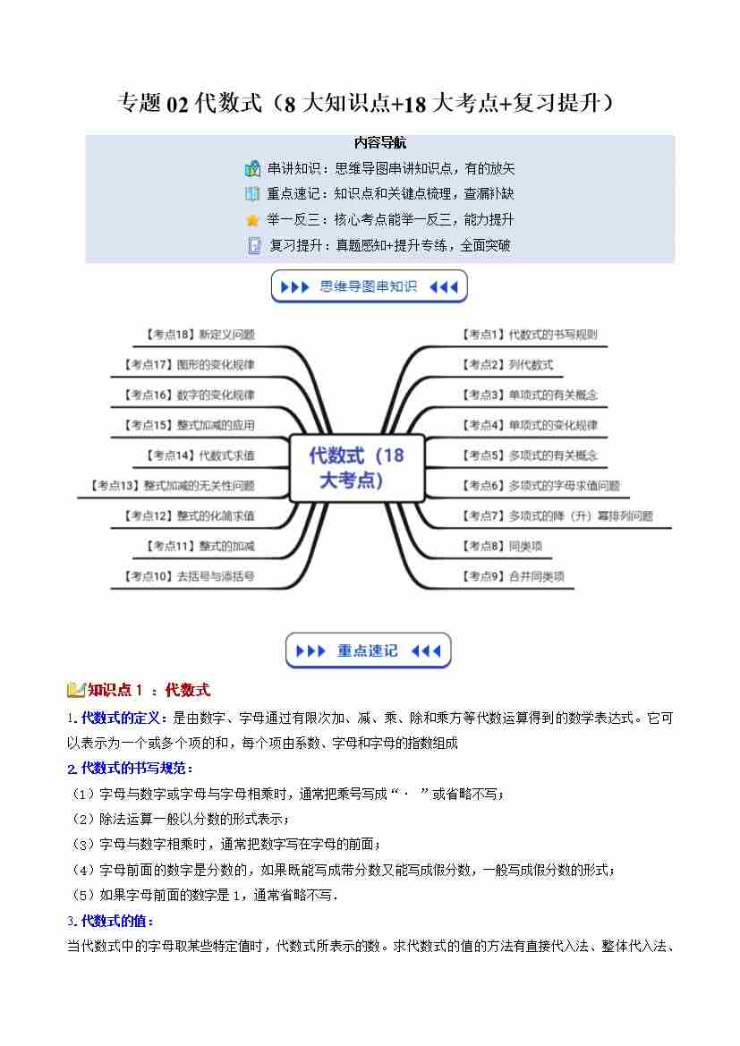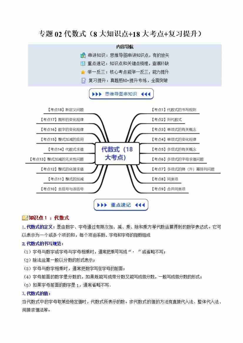 【苏科版】七上数学寒假复习讲义专题02:代数式(8大知识点18大考点复习提升)(原卷版)