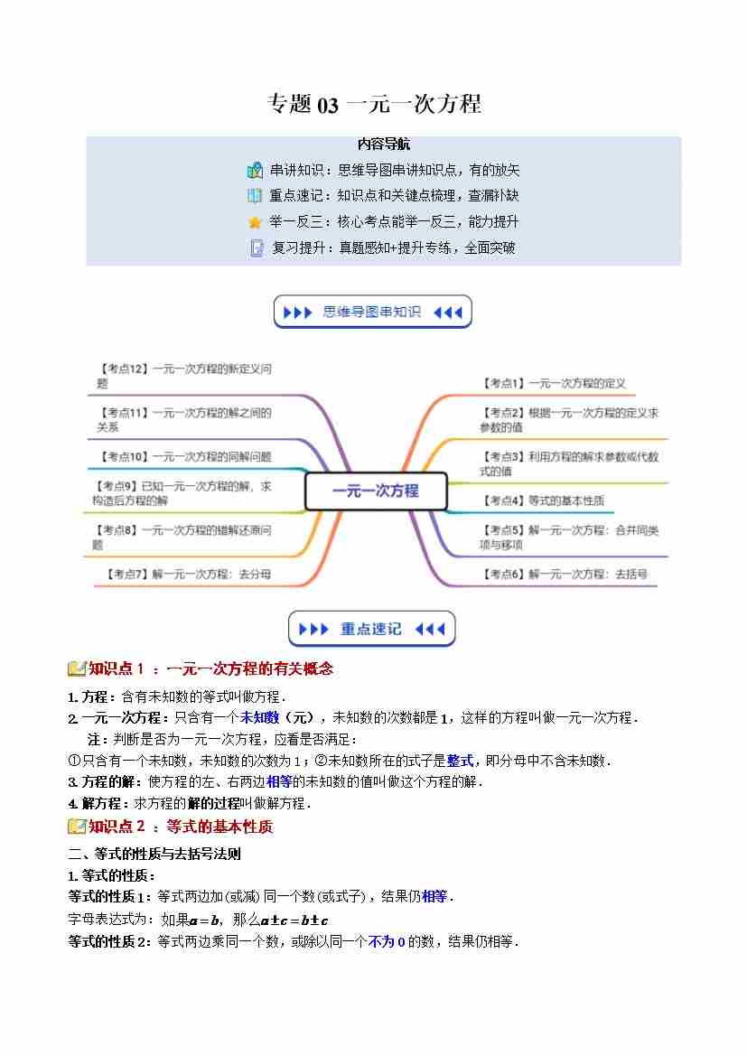 【苏科版】七上数学寒假复习讲义专题03:一元一次方程(3大知识点12大考点复习提升)(解析版)