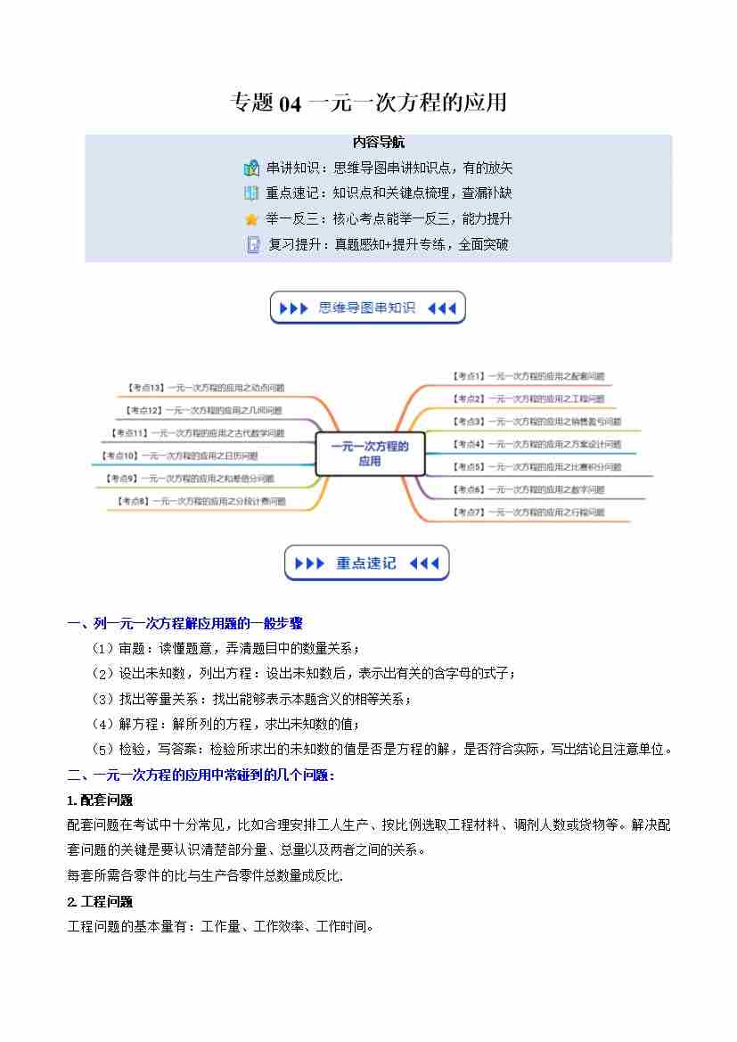 【苏科版】七上数学寒假复习讲义专题04:一元一次方程的应用大题专练(2大知识点13大考点复习提升)(原卷版)