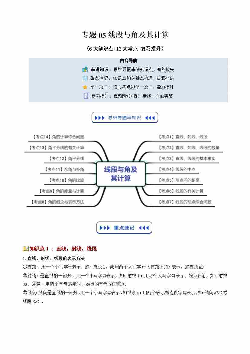 【苏科版】七上数学寒假复习讲义专题05:线段与角及其计算(6大知识点12大考点复习提升)(原卷版)