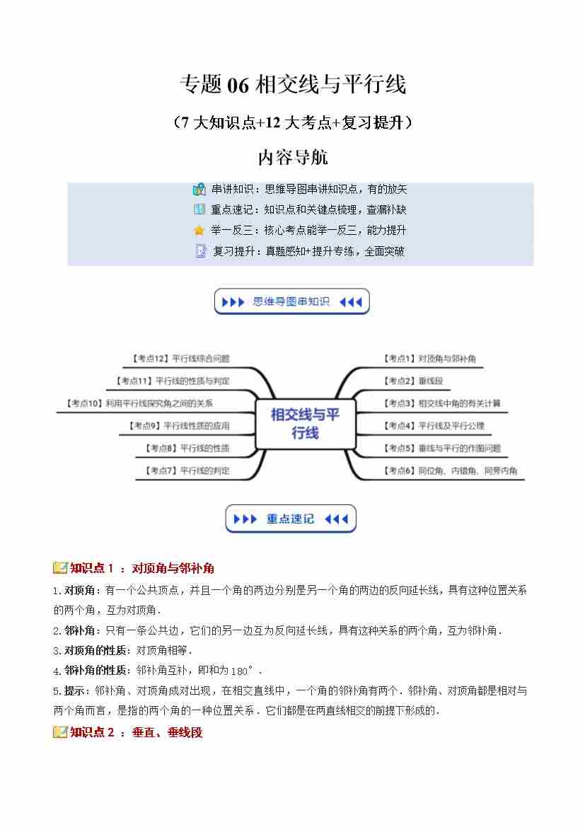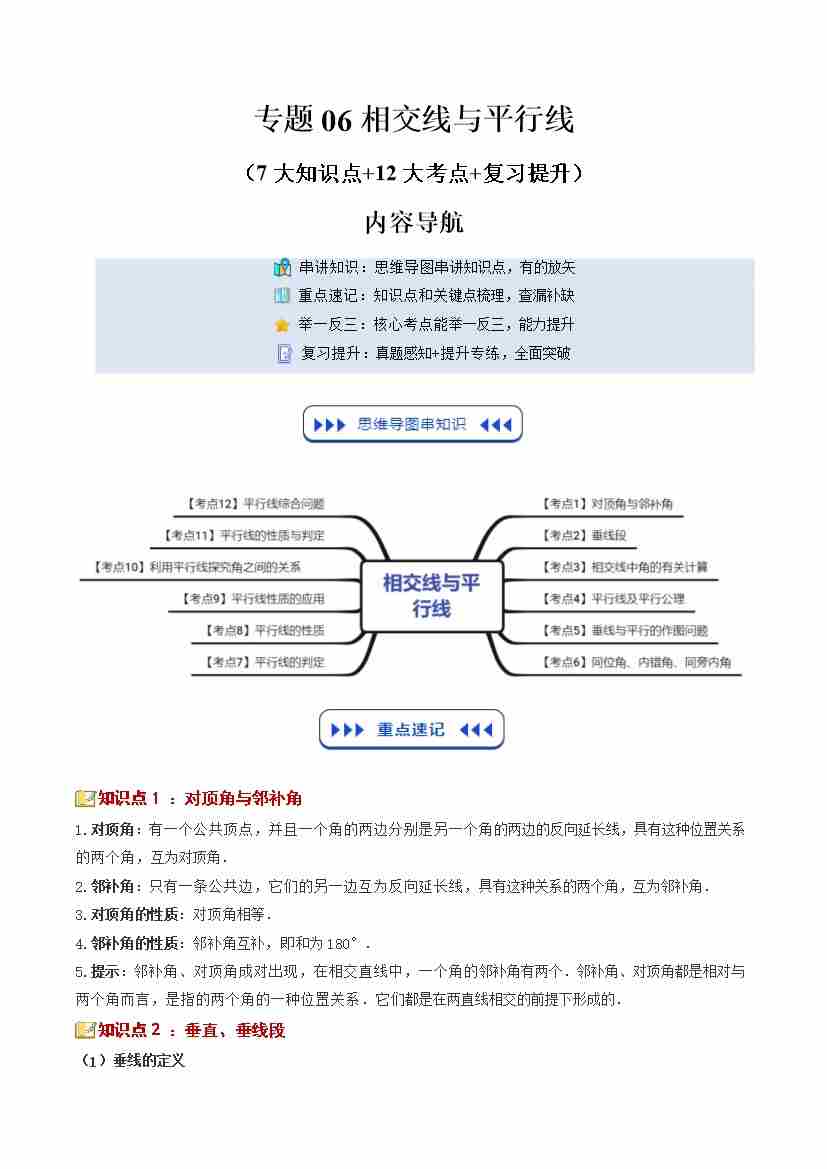 【苏科版】七上数学寒假复习讲义专题06:相交线与平行线(7大知识点12大考点复习提升)(解析版)