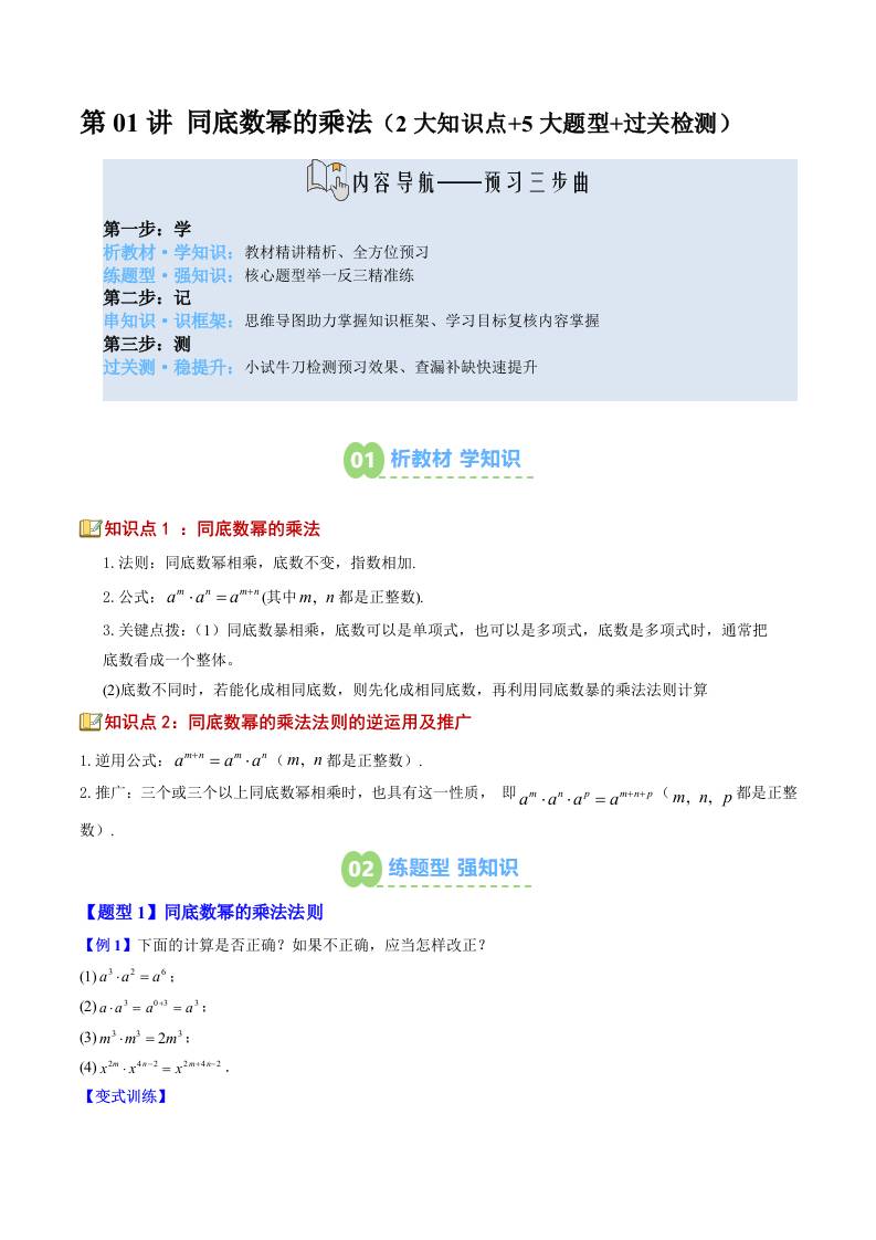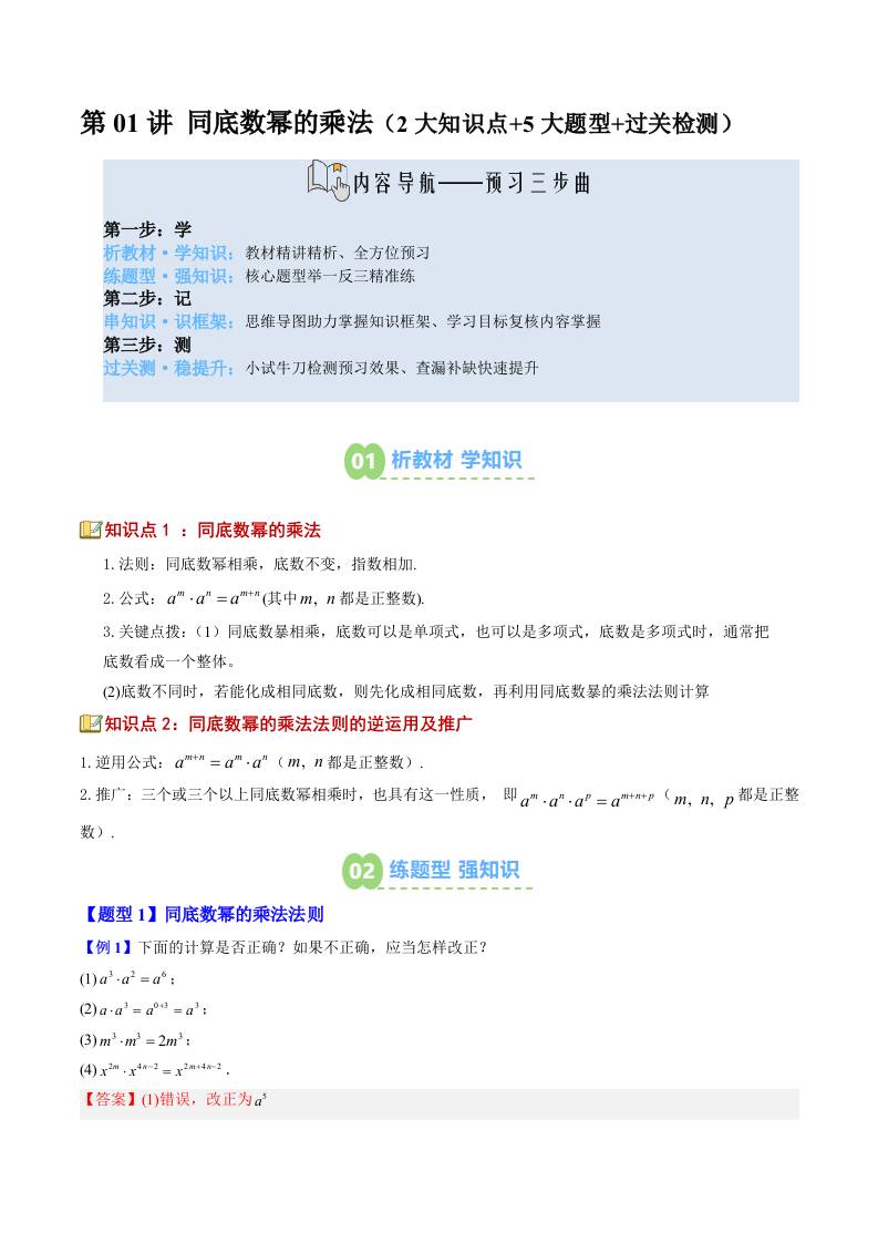 【苏科版】七下数学寒假预习讲义-第01讲:同底数幂的乘法(2大知识点5大题型过关检测)(解析版)
