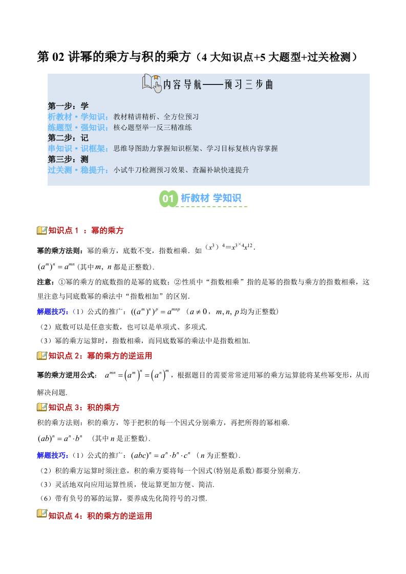 【苏科版】七下数学寒假预习讲义-第02讲:幂的乘方与积的乘方(4大知识点5大题型过关检测) (解析版)