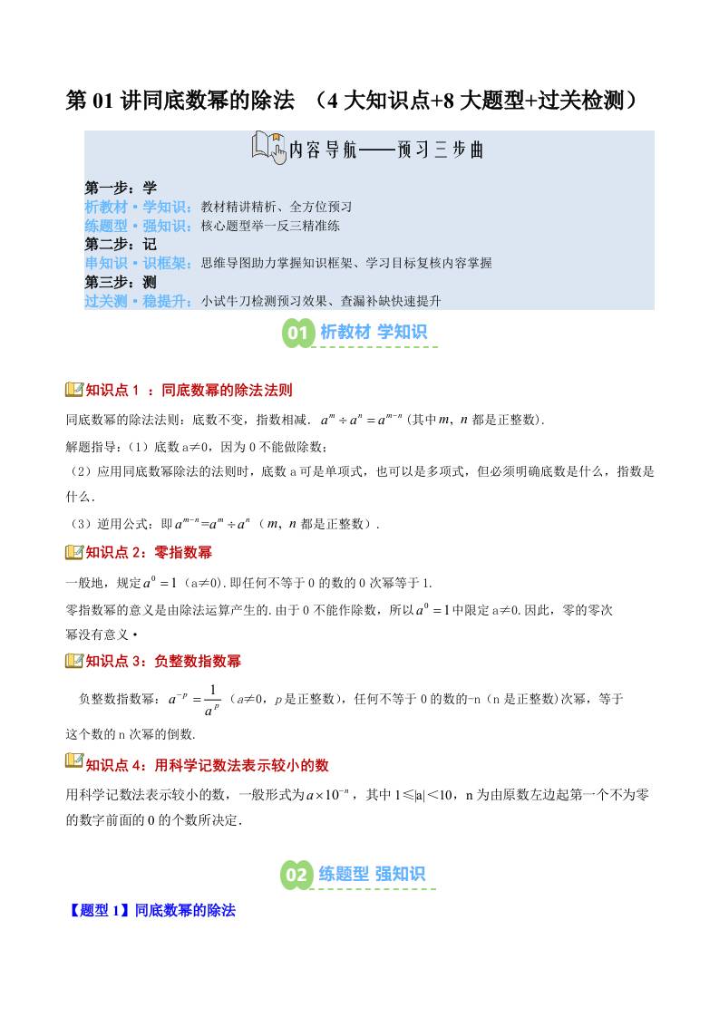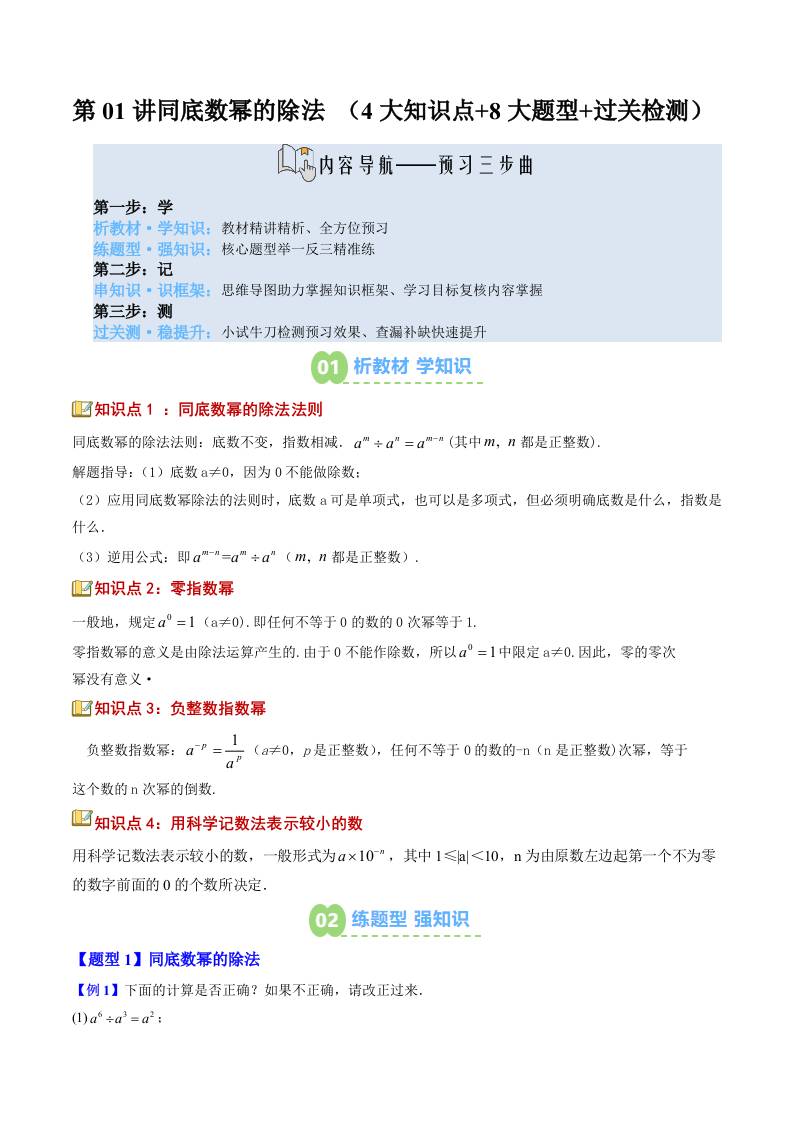 【苏科版】七下数学寒假预习讲义-第03讲:同底数幂的除法(4大知识点8大题型过关检测)(解析版)