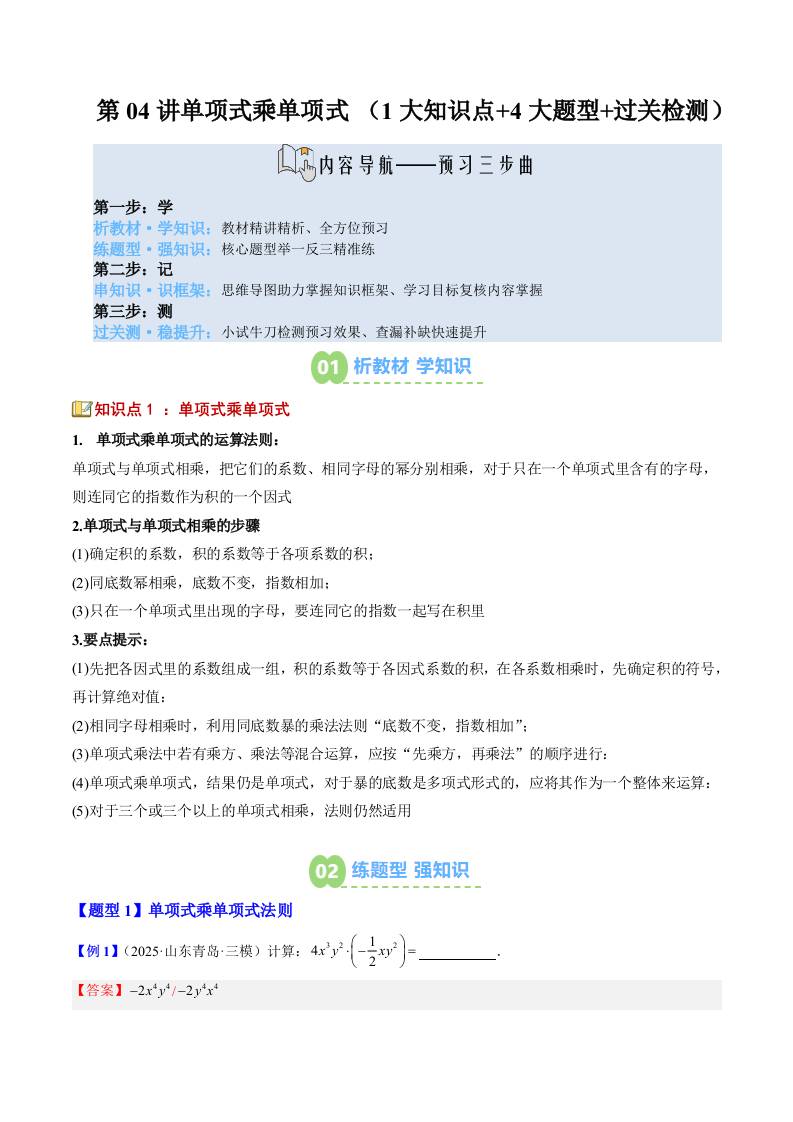 【苏科版】七下数学寒假预习讲义-第04讲:单项式乘单项式(1大知识点4大题型过关检测)(解析版)