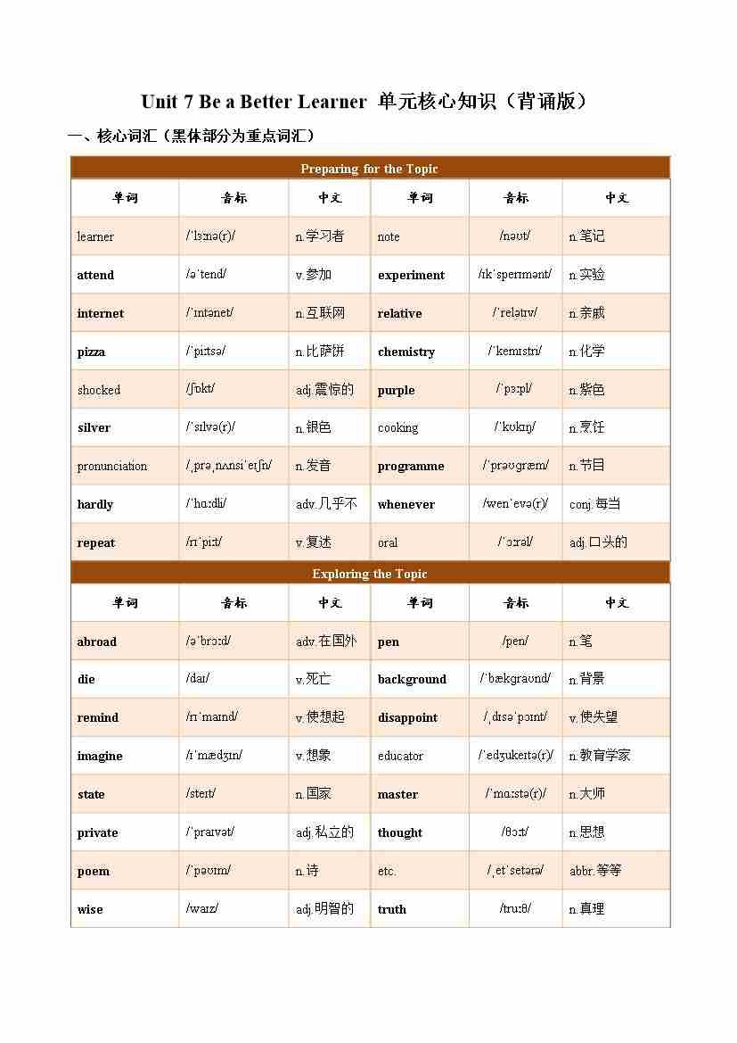 Unit 7 Be a Better Learner 单元核心知识(背诵默写任务单)(背诵版)