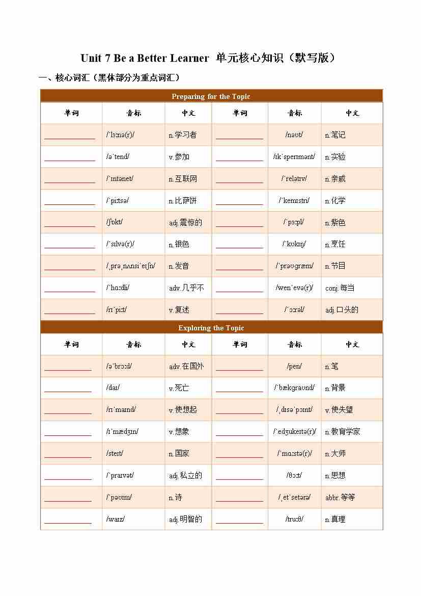 Unit 7 Be a Better Learner 单元核心知识(背诵默写任务单)(默写版)