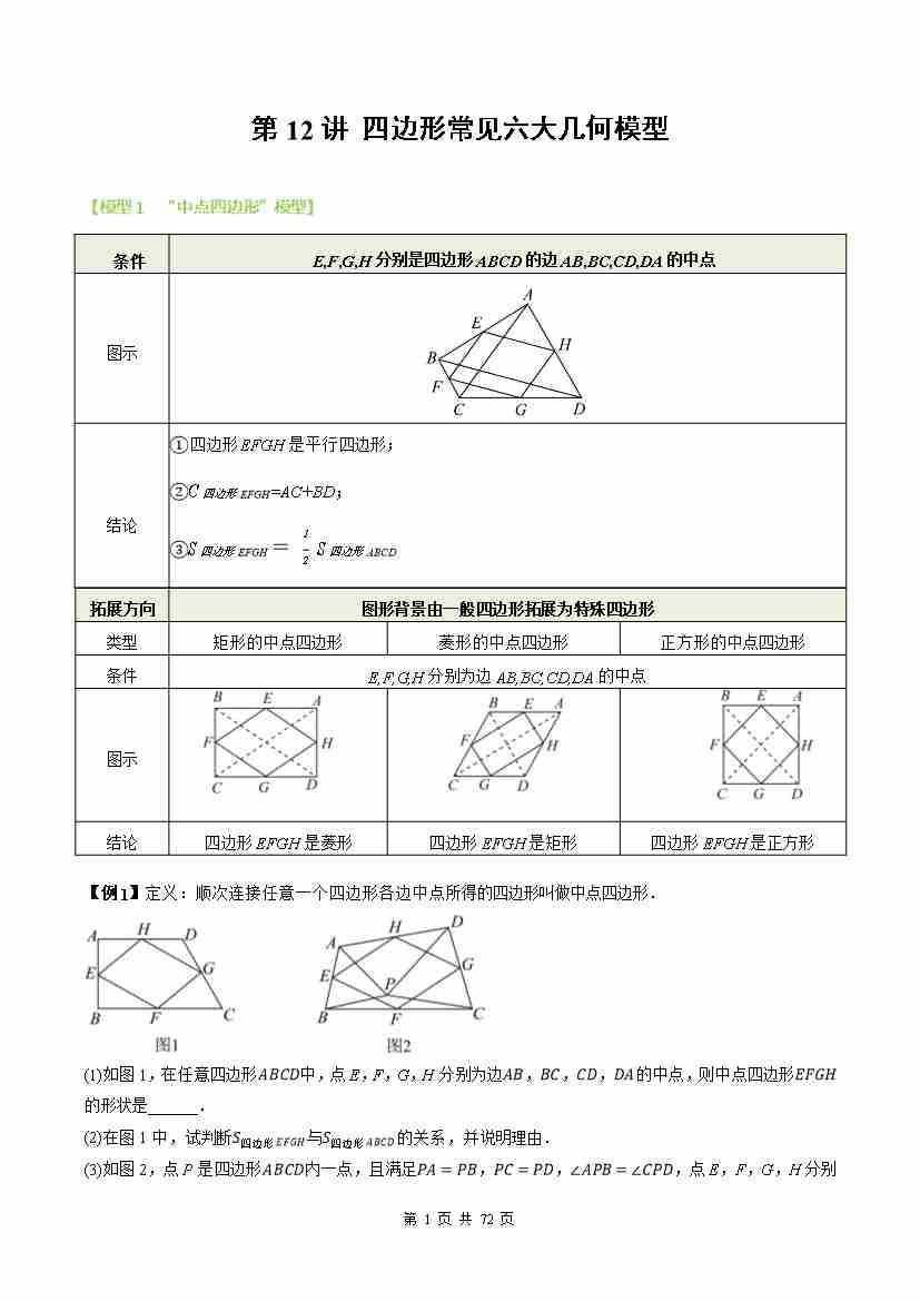 ②寒假预习-第12讲 四边形常见六大几何模型(6个模型过关测)-2026年八年级数学寒假衔接讲练 (人教版-新教材)(教师版)