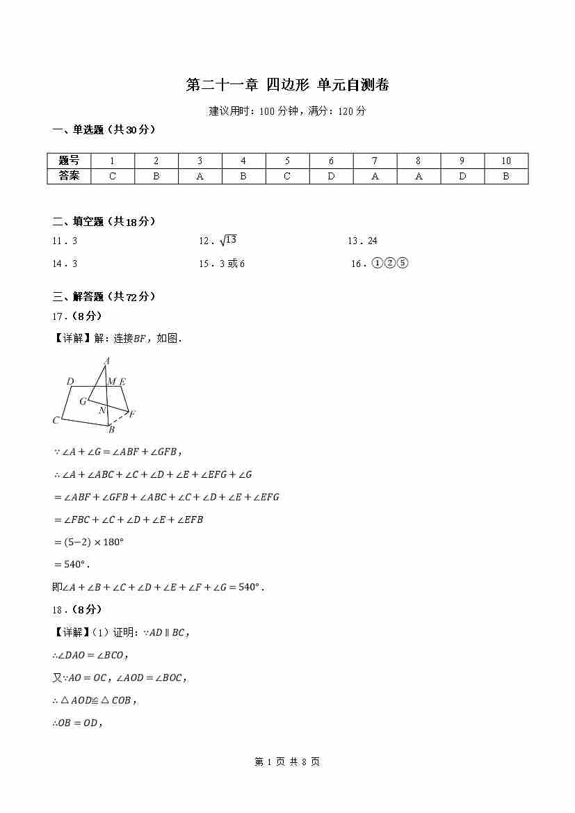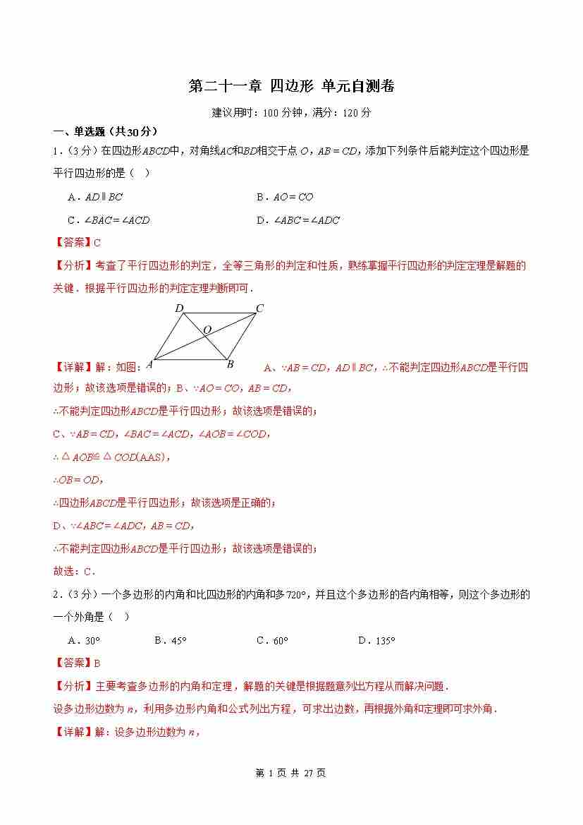②寒假预习-第二十一章 四边形(单元自测卷)(教师版)-2026年八年级数学寒假衔接讲练 (人教版-新教材)