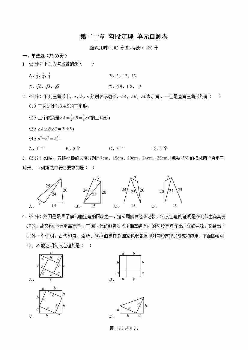 ②寒假预习-第二十章 勾股定理(单元自测卷)(学生版)-2026年八年级数学寒假衔接讲练 (人教版-新教材)