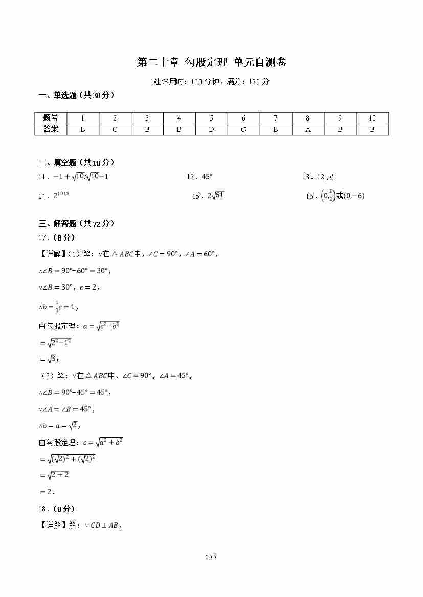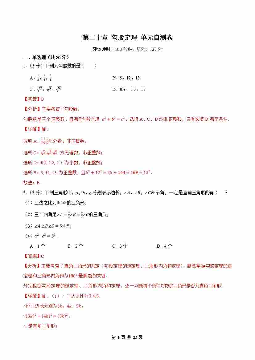 ②寒假预习-第二十章 勾股定理(单元自测卷)(教师版)-2026年八年级数学寒假衔接讲练 (人教版-新教材)