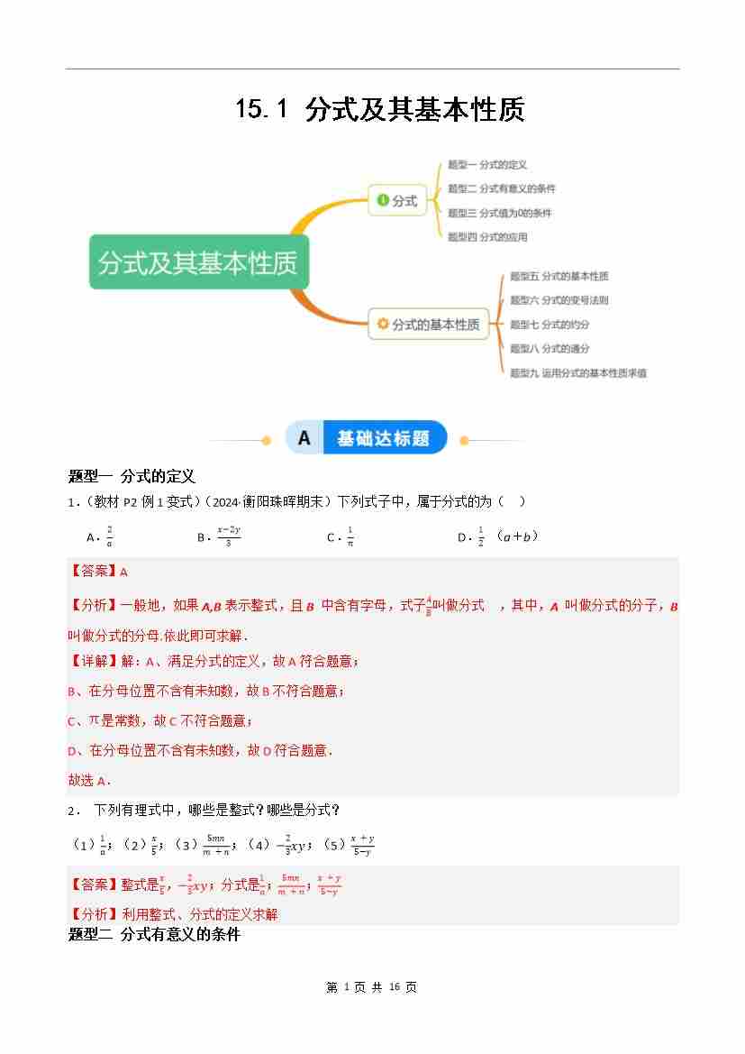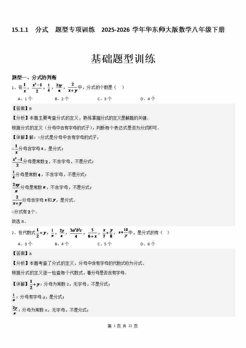 15.1.1 分式 题型专项训练 2025-2026学年华东师大版数学八年级下册--解析版