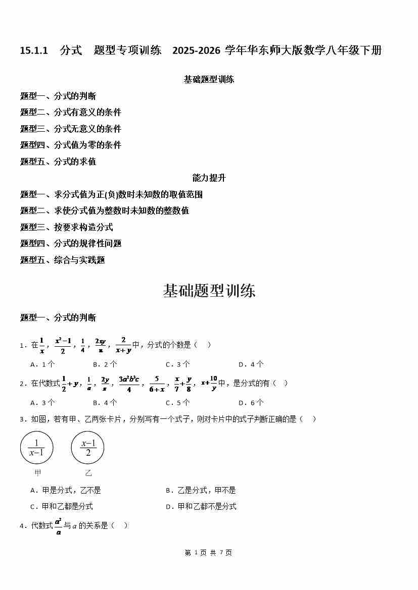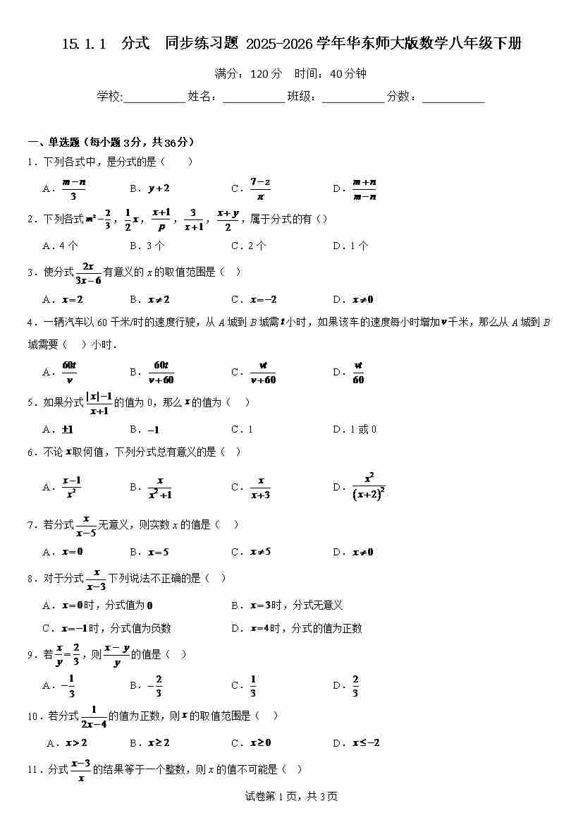 15.1.1 分式 同步练习题 2025-2026学年华东师大版数学八年级下册