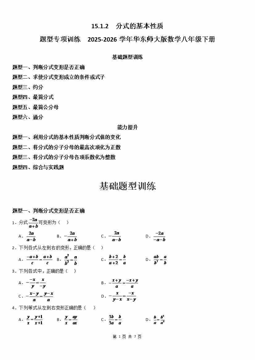 15.1.2 分式的基本性质 题型专项训练 2025-2026学年华东师大版数学八年级下册--原卷版