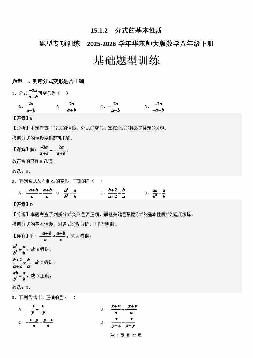 15.1.2 分式的基本性质 题型专项训练 2025-2026学年华东师大版数学八年级下册--解析版