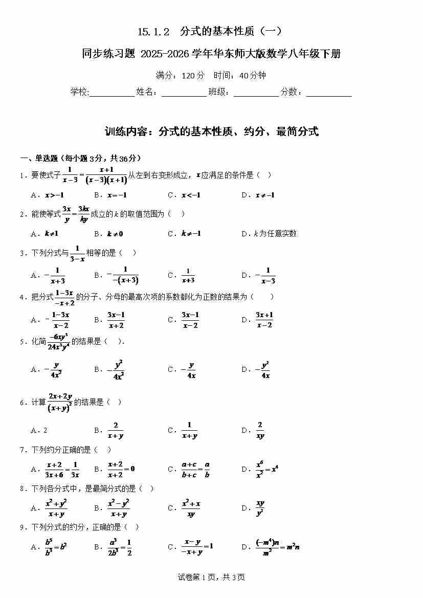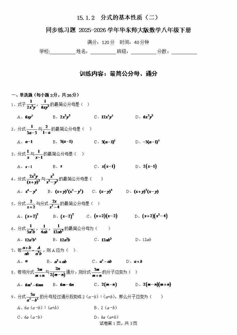 15.1.2 分式的基本性质(二) 同步练习题 2025-2026学年华东师大版数学八年级下册