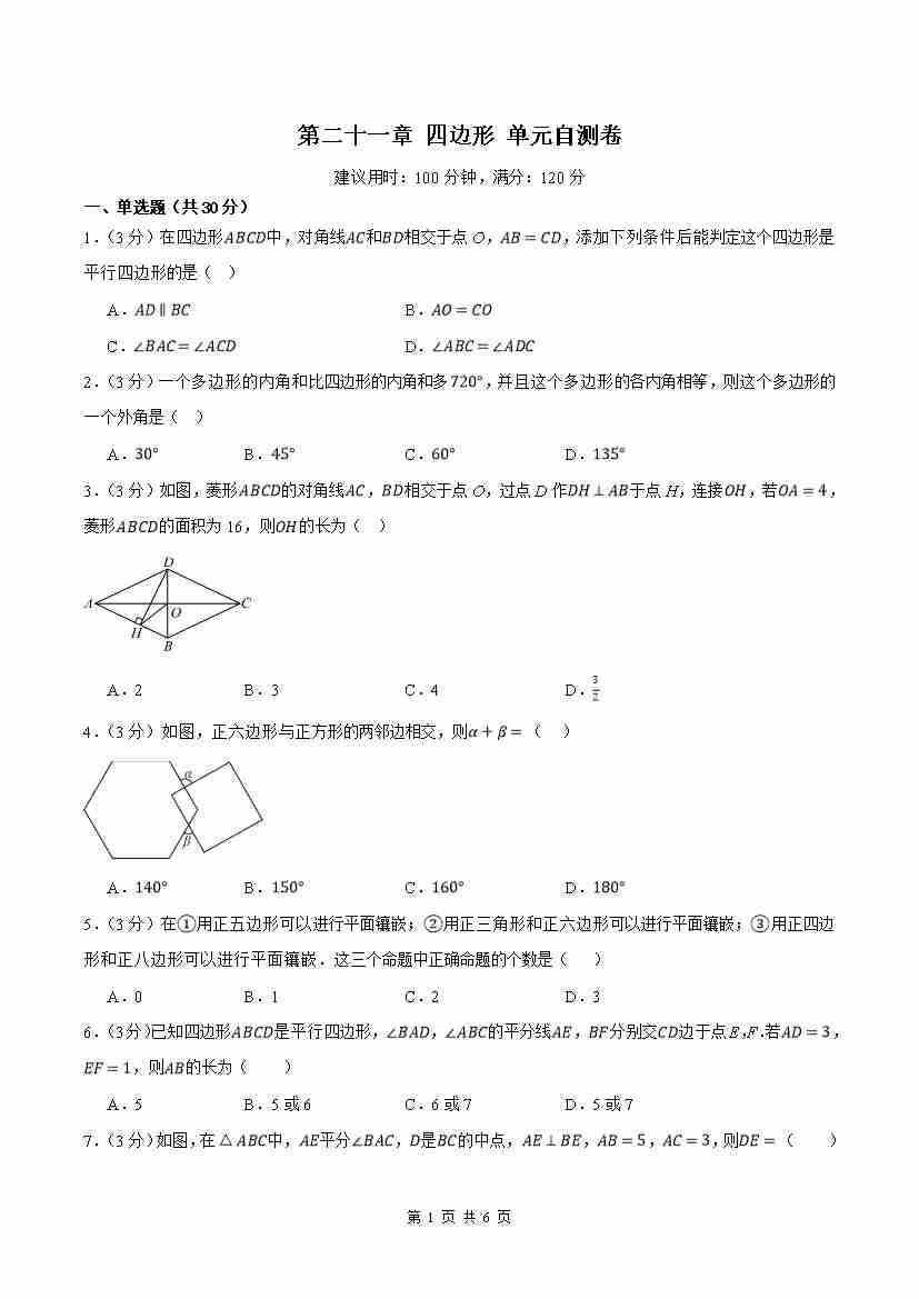 ②寒假预习-第二十一章 四边形(单元自测卷)(学生版)-2026年八年级数学寒假衔接讲练 (人教版-新教材)