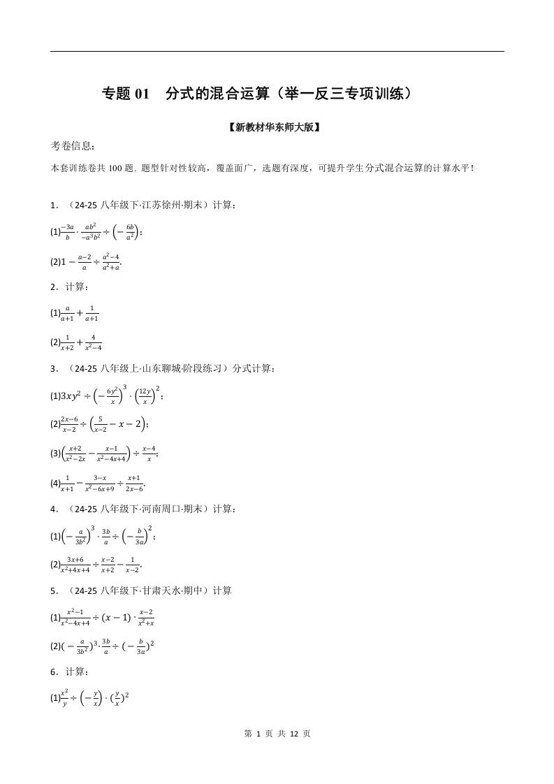 专题01 分式的混合运算(100题)(举一反三专项训练)数学新教材华东师大版八年级下册(试题版)