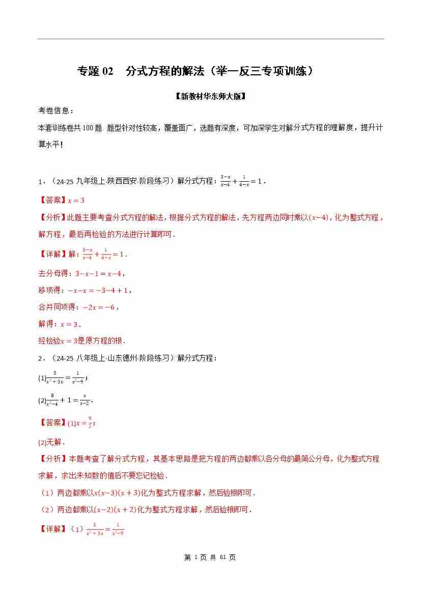 专题02 分式方程的解法(100题)(举一反三专项训练)数学新教材华东师大版八年级下册(解析版)