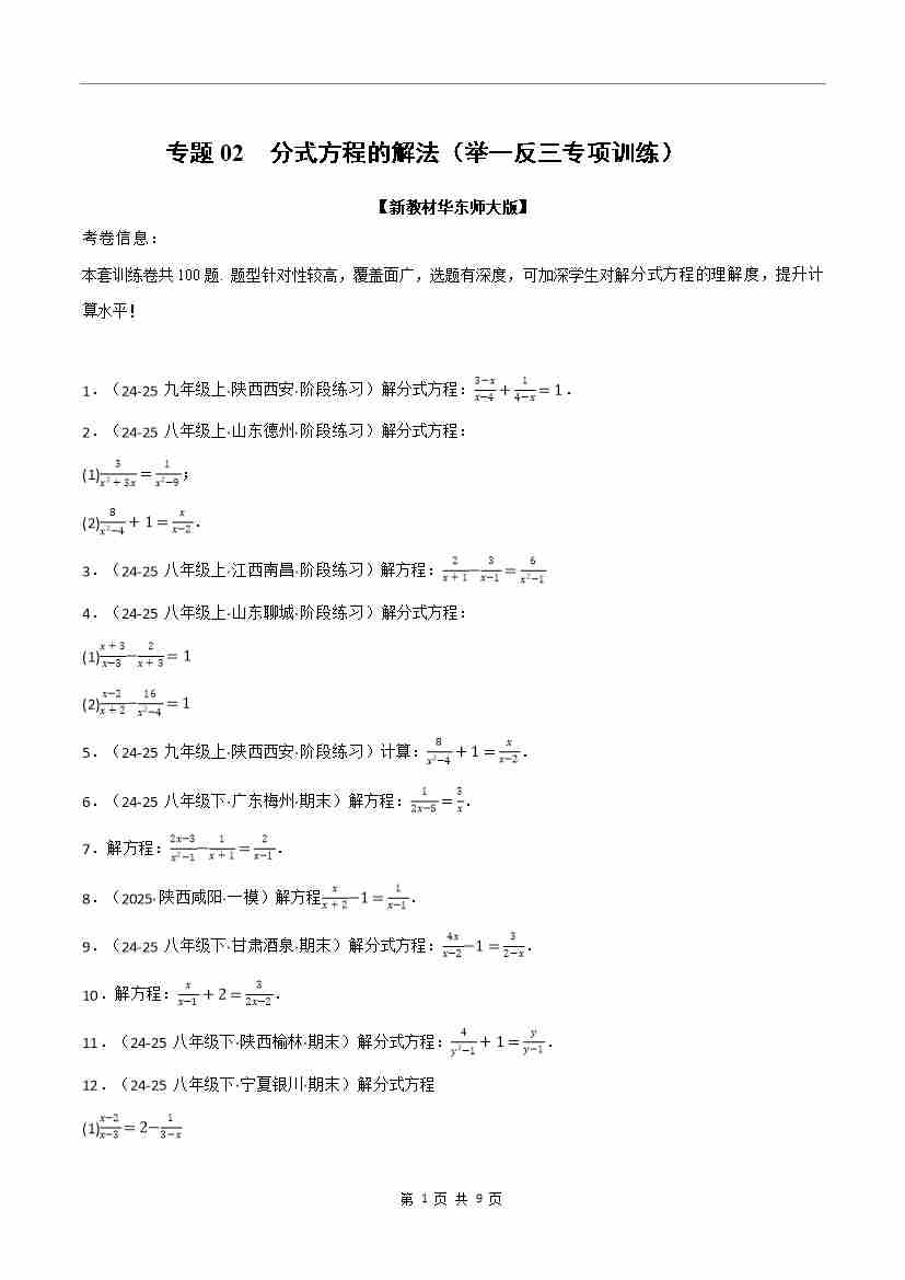 专题02 分式方程的解法(100题)(举一反三专项训练)数学新教材华东师大版八年级下册(试题版)