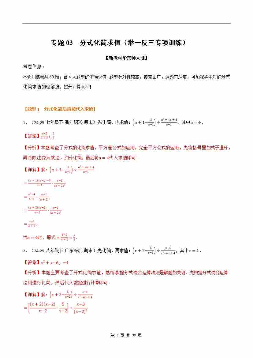 专题03 分式化简求值(60题)(举一反三专项训练)数学新教材华东师大版八年级下册(解析版)