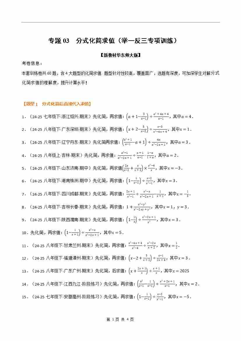 专题03 分式化简求值(60题)(举一反三专项训练)数学新教材华东师大版八年级下册(试题版)