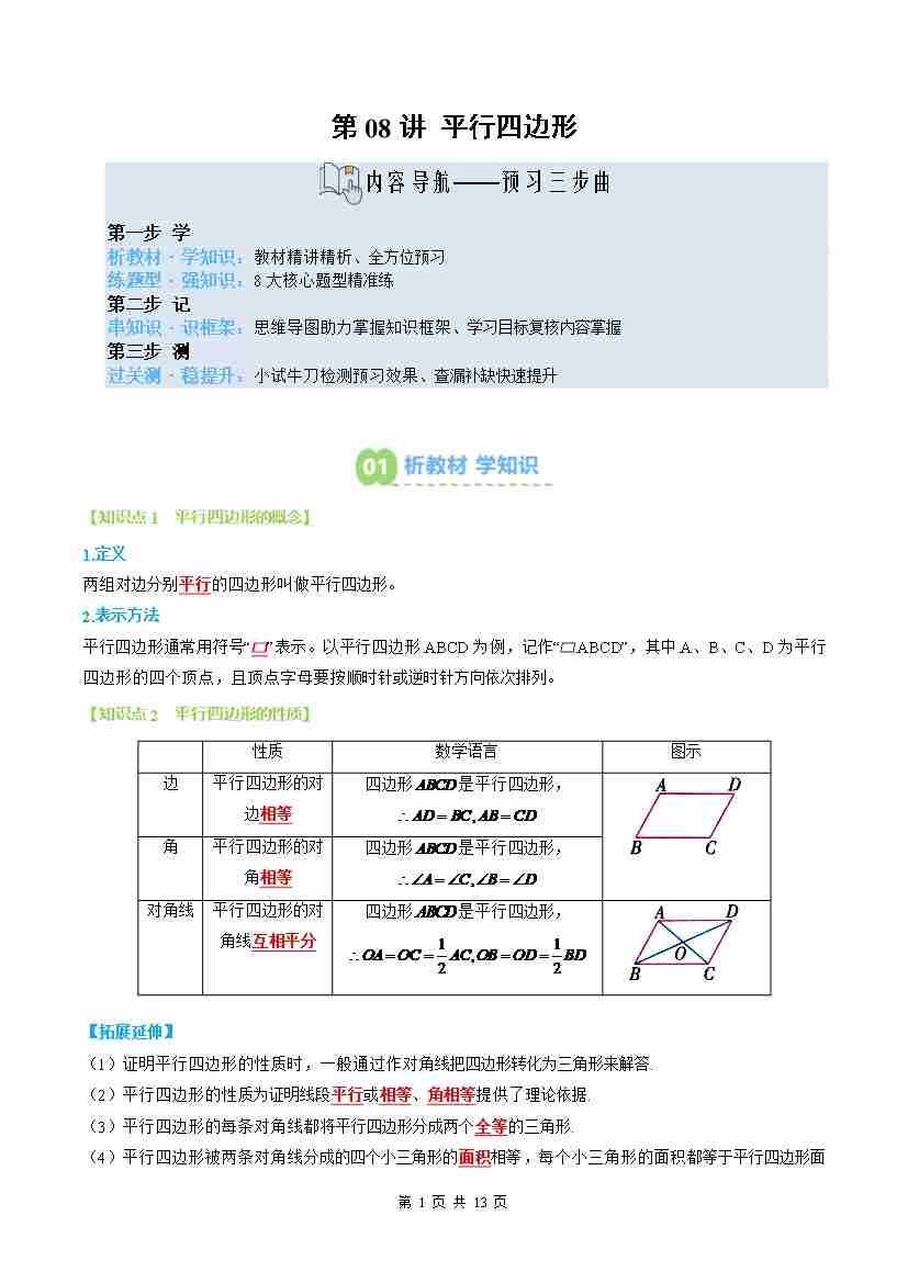②寒假预习-第08讲 平行四边形(5个知识点8个题型思维导图过关测)(教师版)-2026年八年级数学寒假衔接讲练 (人教版-新教材)