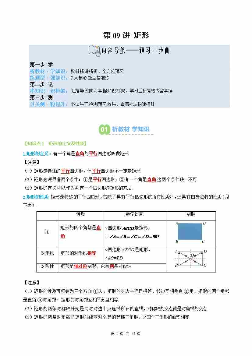 ②寒假预习-第09讲 矩形(3个知识点7个题型思维导图过关测)(教师版)-2026年八年级数学寒假衔接讲练 (人教版-新教材)