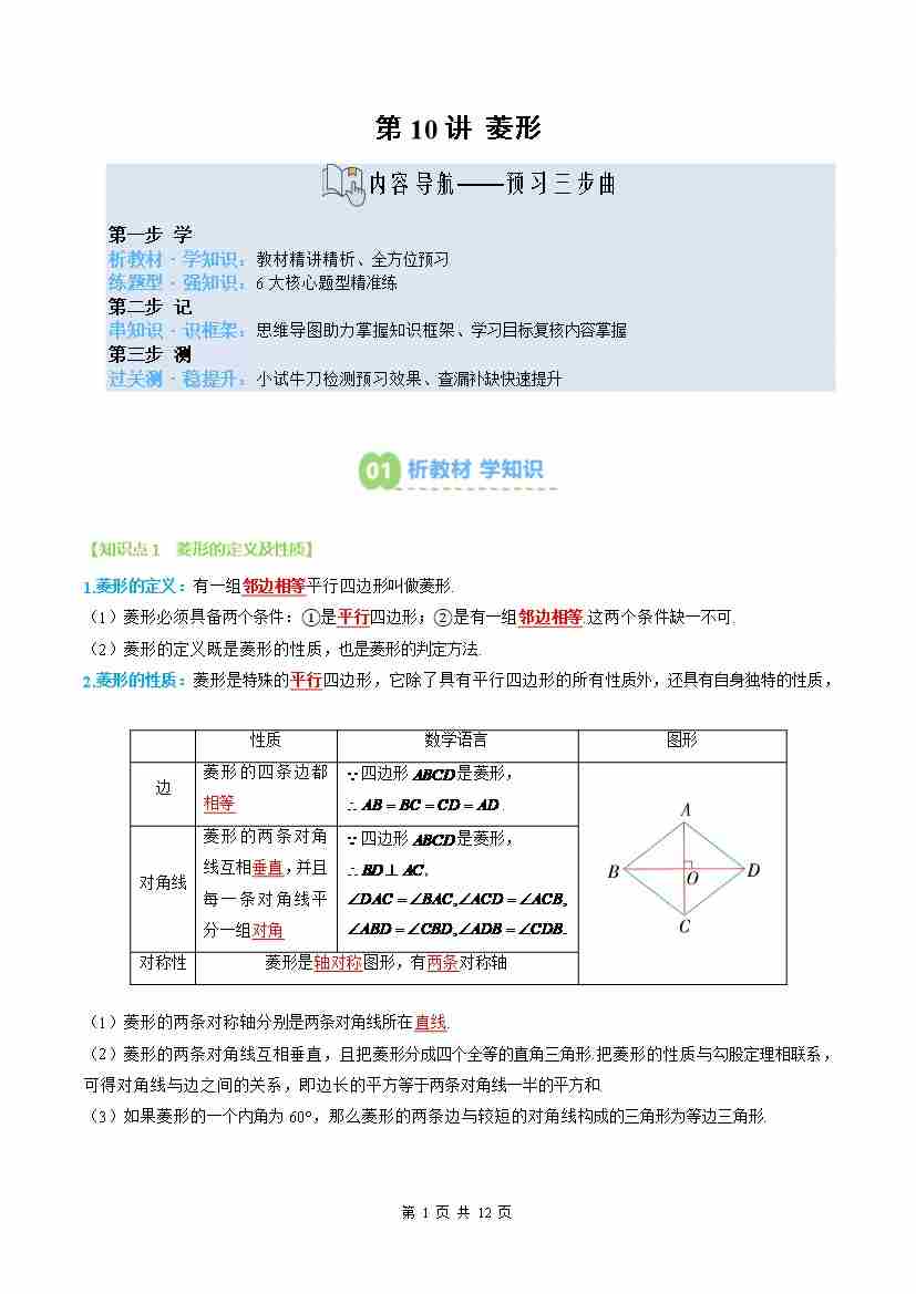 ②寒假预习-第10讲 菱形(2个知识点6个题型思维导图过关测)-2026年八年级数学寒假衔接讲练 (人教版-新教材)(学生版)