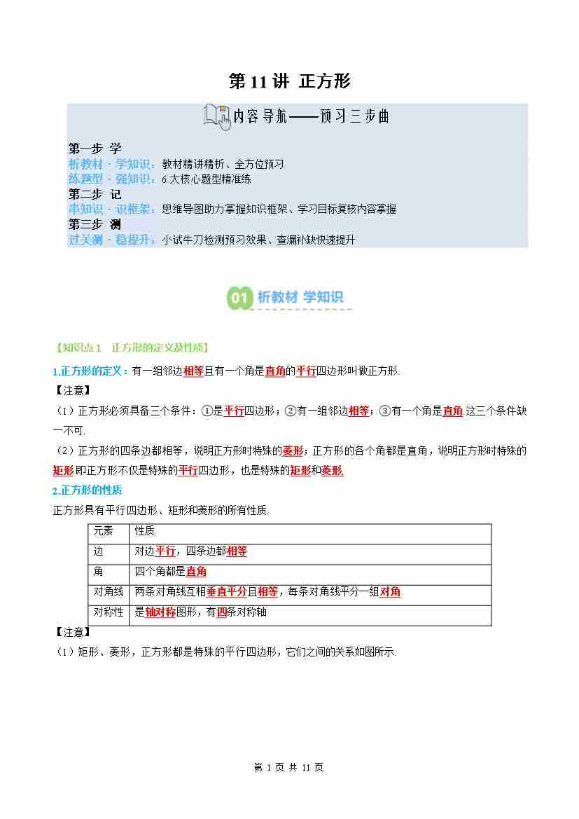 ②寒假预习-第11讲 正方形(2个知识点6个题型思维导图过关测)-2026年八年级数学寒假衔接讲练 (人教版-新教材)(学生版)