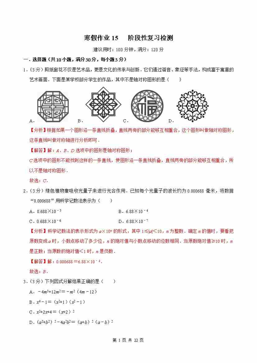 ③寒假培优练-专题15 阶段性复习检测(巩固培优)(教师版)-2026年八年级数学寒假衔接讲练 (人教版-新教材)