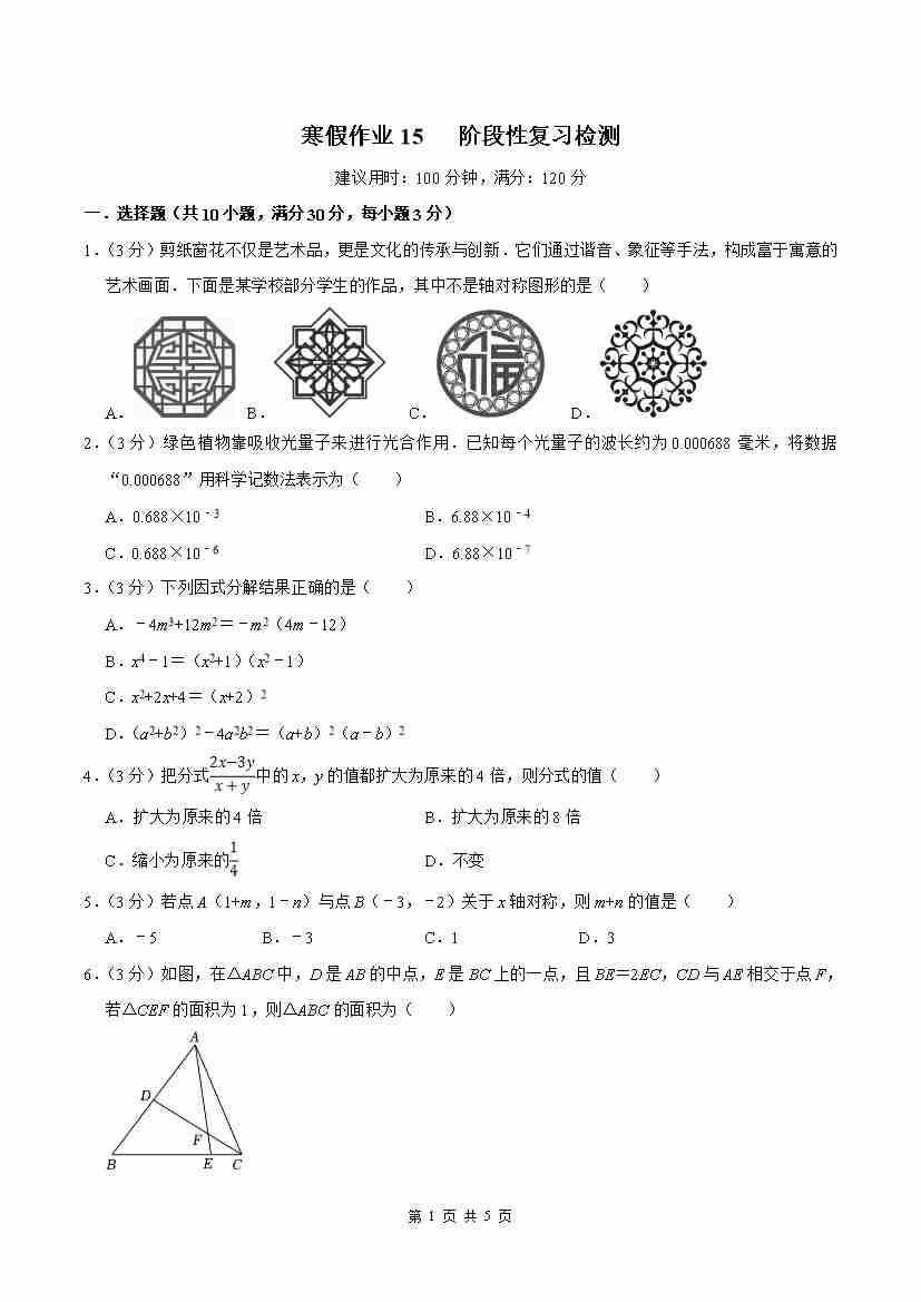 ③寒假培优练-专题15 阶段性复习检测(巩固培优)(试题版)-2026年八年级数学寒假衔接讲练 (人教版-新教材)