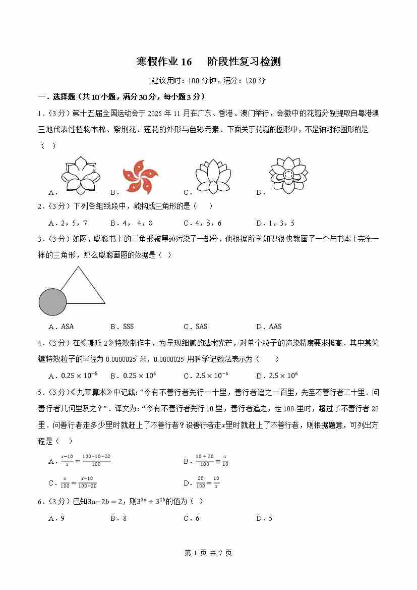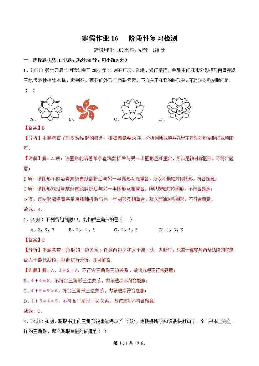 ③寒假培优练-专题16 阶段性复习检测(巩固培优)(学生版)-2026年八年级数学寒假衔接讲练 (人教版-新教材)