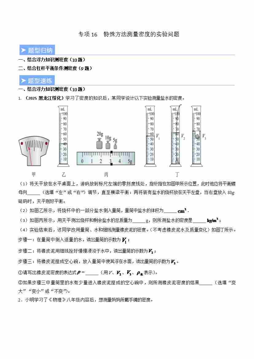 专项16 特殊方法测量密度的实验问题 (重难点训练)(原卷版)