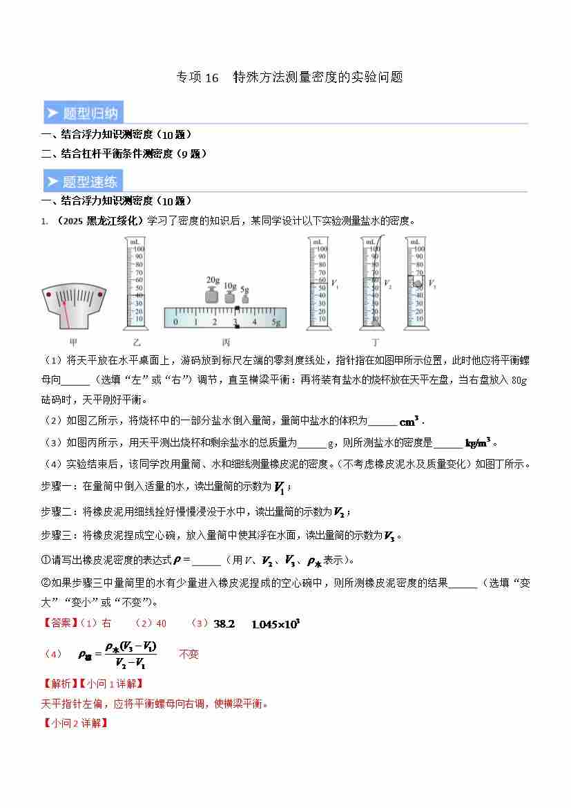 专项16 特殊方法测量密度的实验问题 (重难点训练)(解析版)