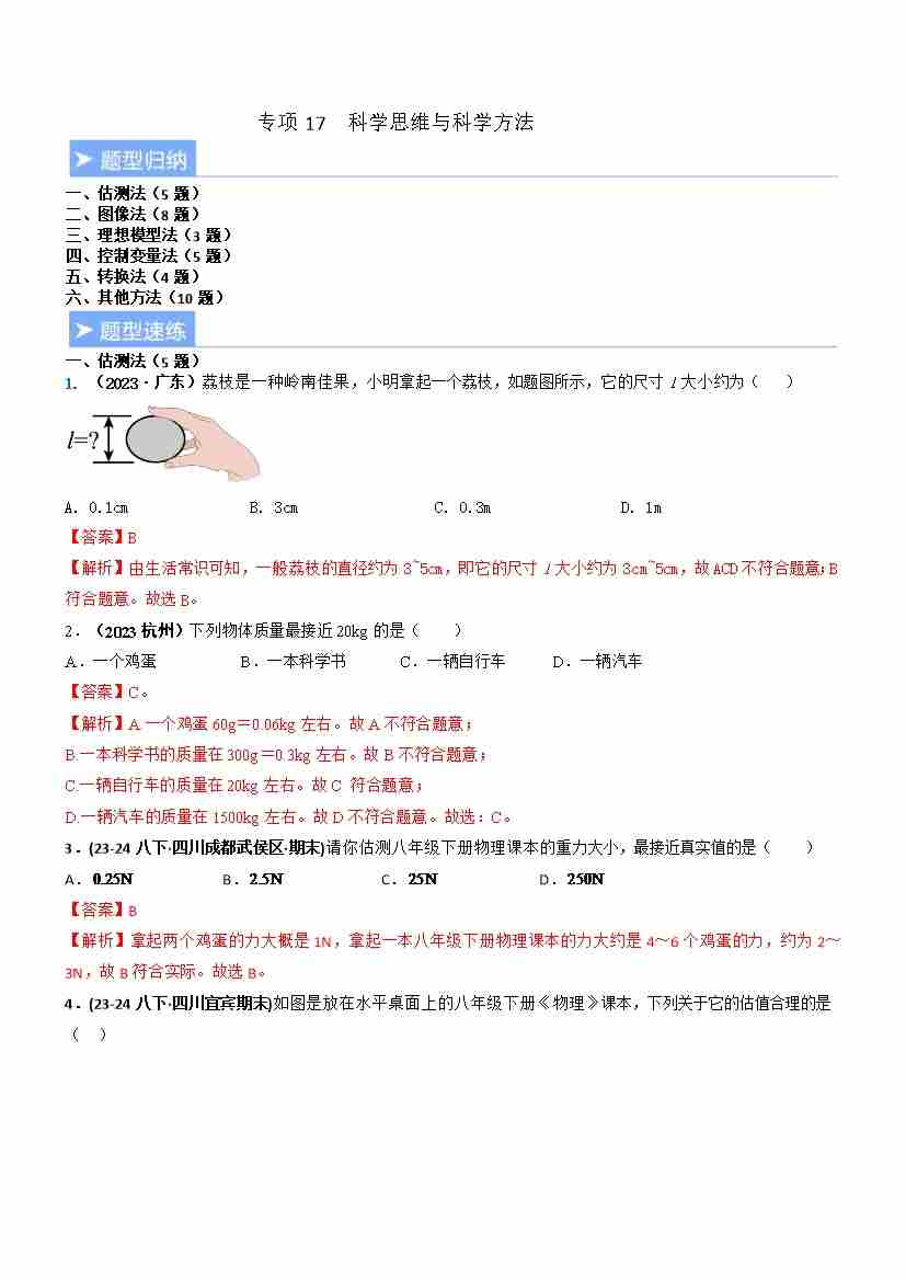专项17 科学思维与科学方法 (重难点训练)(解析版)