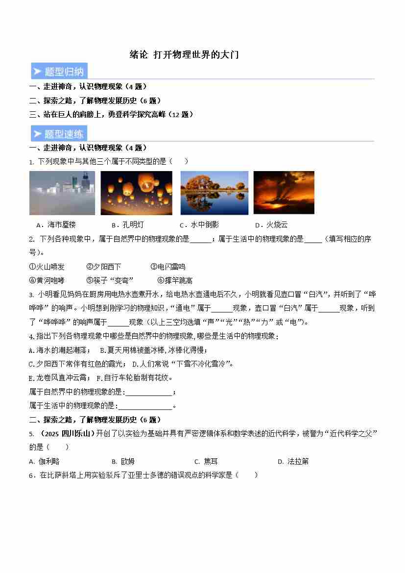 绪论 打开物理世界的大门(重难点训练)(原卷版)