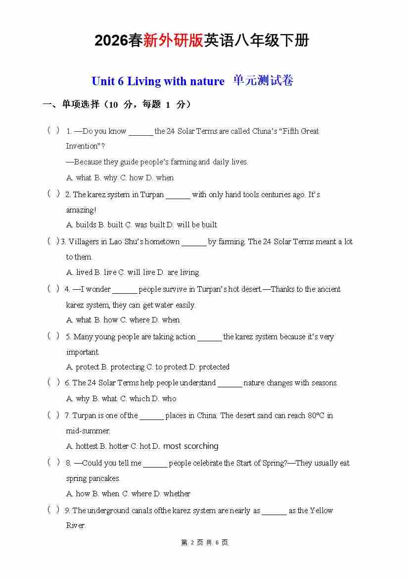 Unit8 A green world单元模拟卷-2025-2026学年译林版英语八年级下册