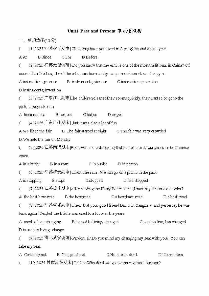 Unit1 Past and Present单元模拟卷-2025-2026学年译林版英语八年级下册