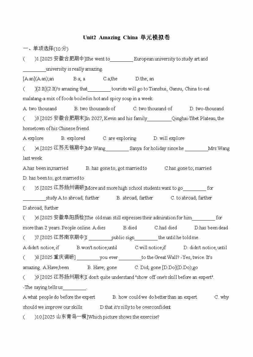 Unit2 Amazing China单元模拟卷-2025-2026学年译林版英语八年级下册