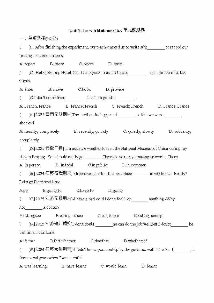 Unit3 The world at one click单元模拟卷-2025-2026学年译林版英语八年级下册