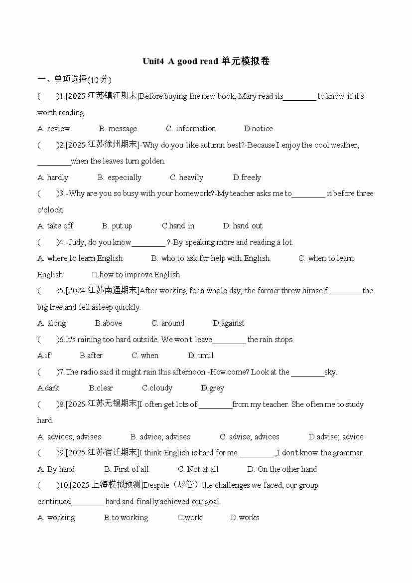 Unit4 A good read单元模拟卷-2025-2026学年译林版英语八年级下册