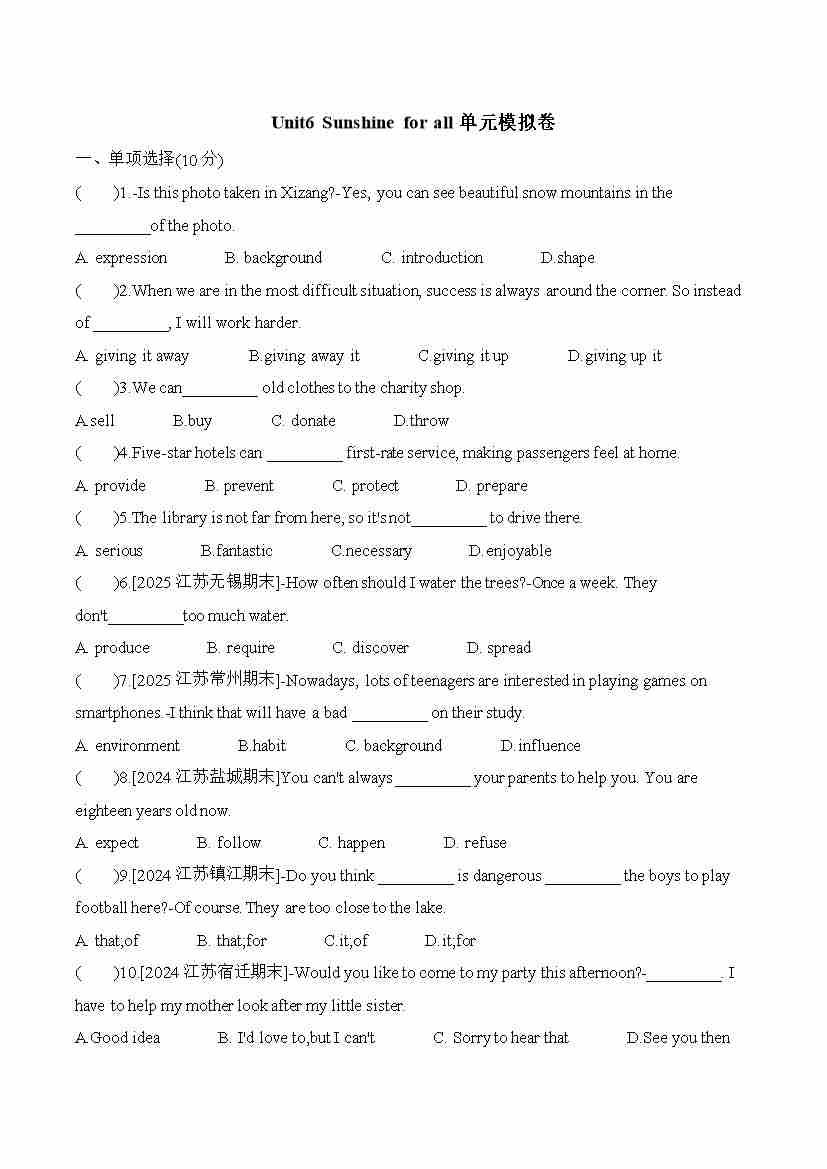 Unit6 Sunshine for all单元模拟卷-2025-2026学年译林版英语八年级下册