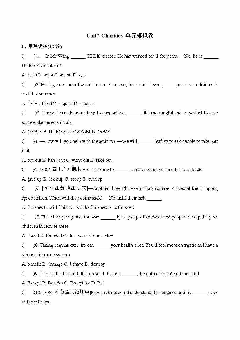 Unit7 Charities单元模拟卷-2025-2026学年译林版英语八年级下册