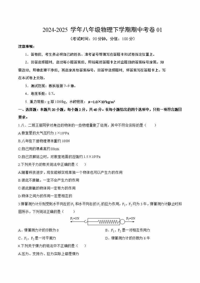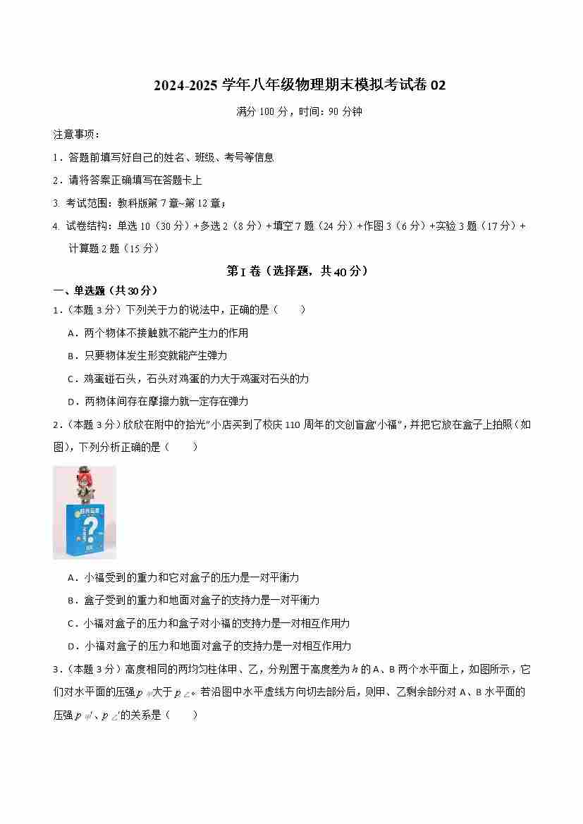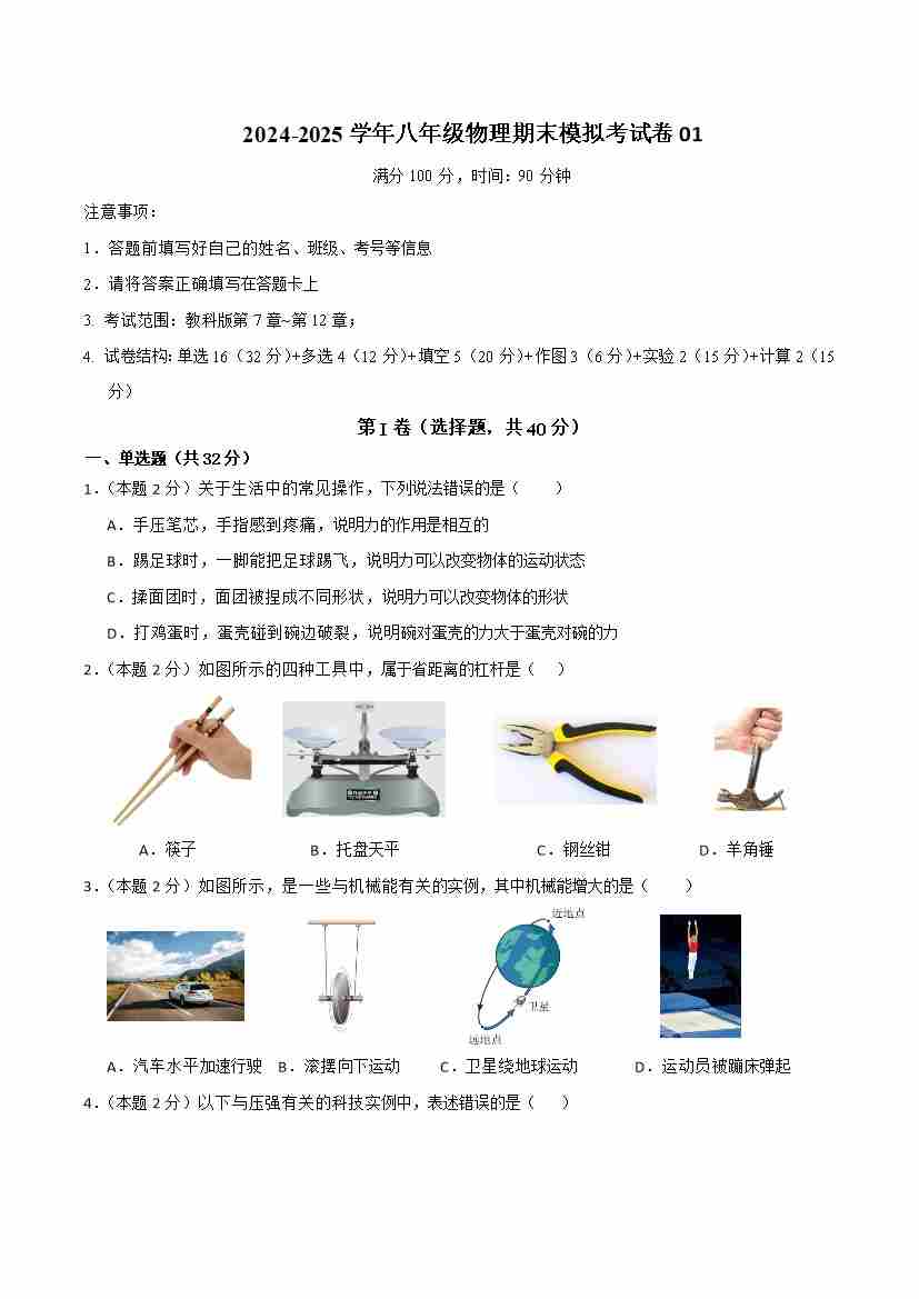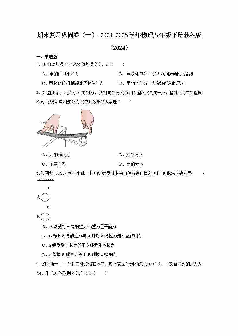 期末复习巩固卷(一)-物理八年级下册教科版(2024)