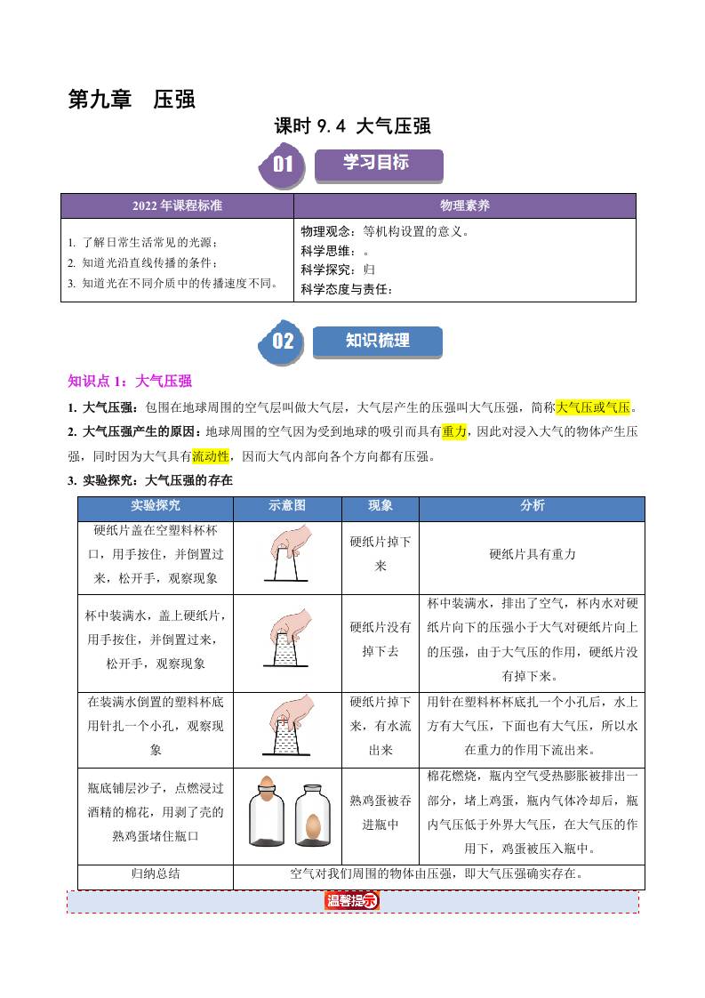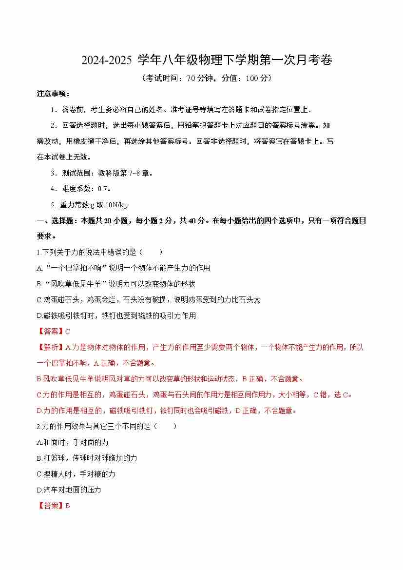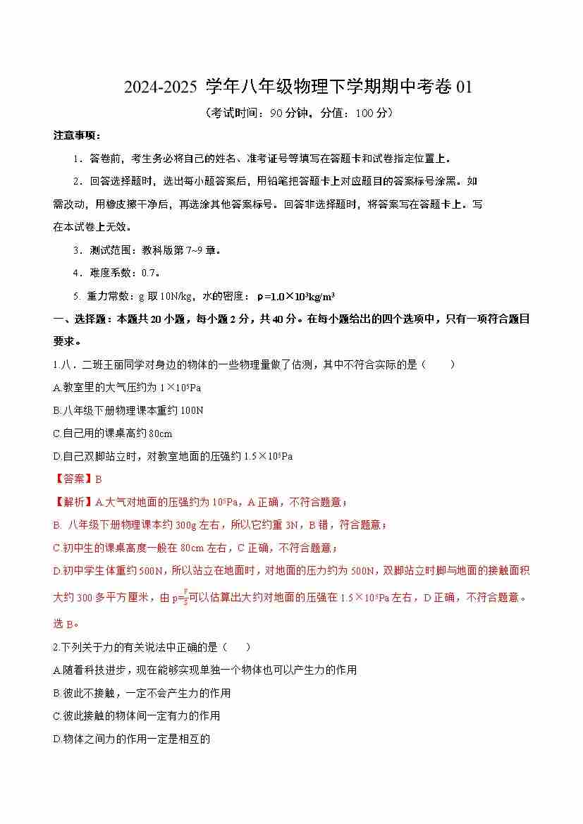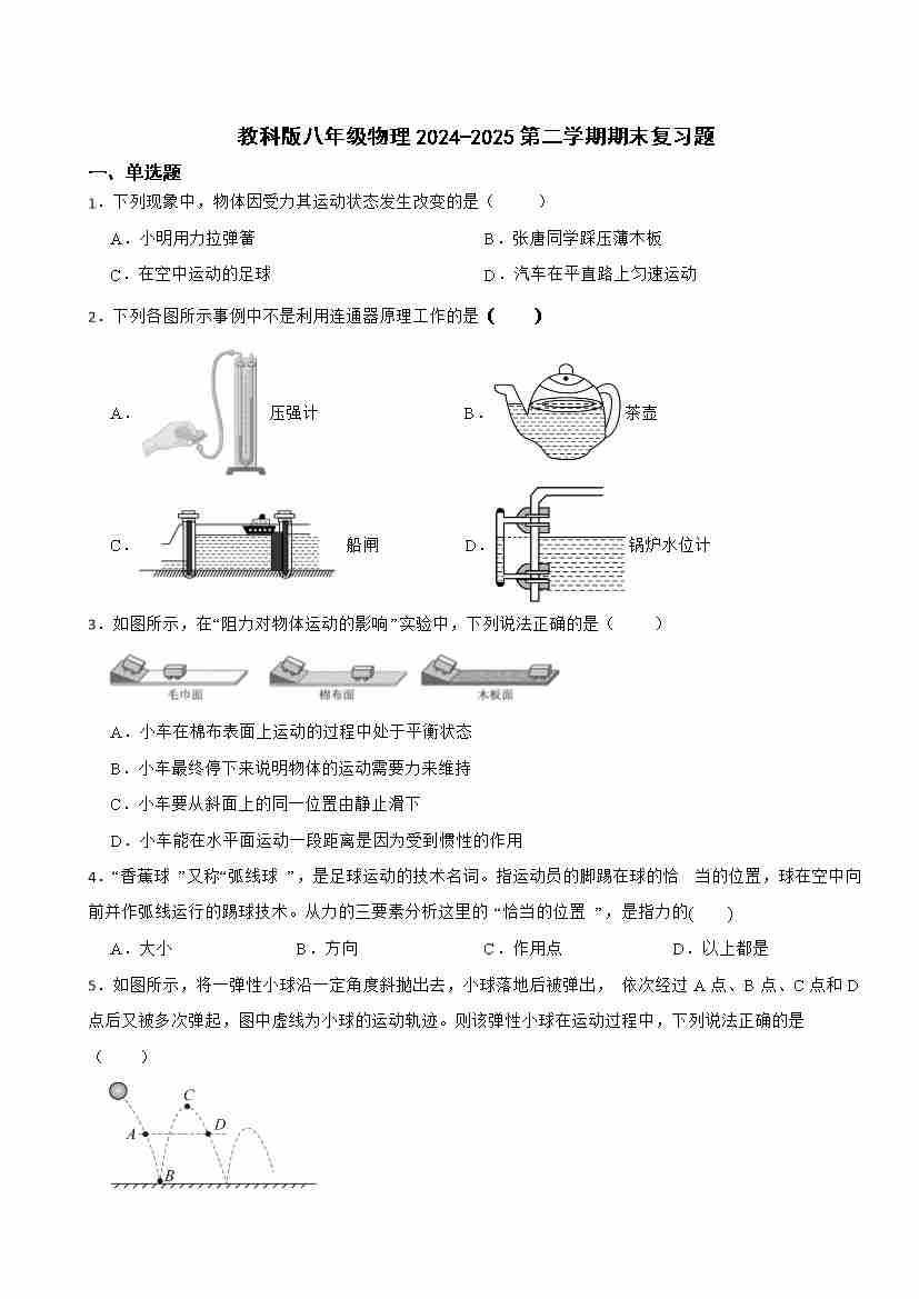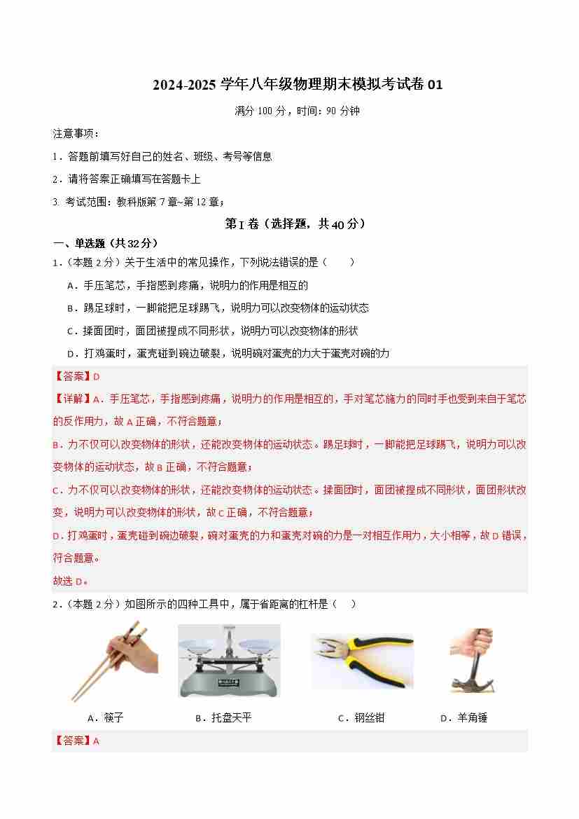期末复习巩固卷(一)-物理八年级下册教科版(2024)