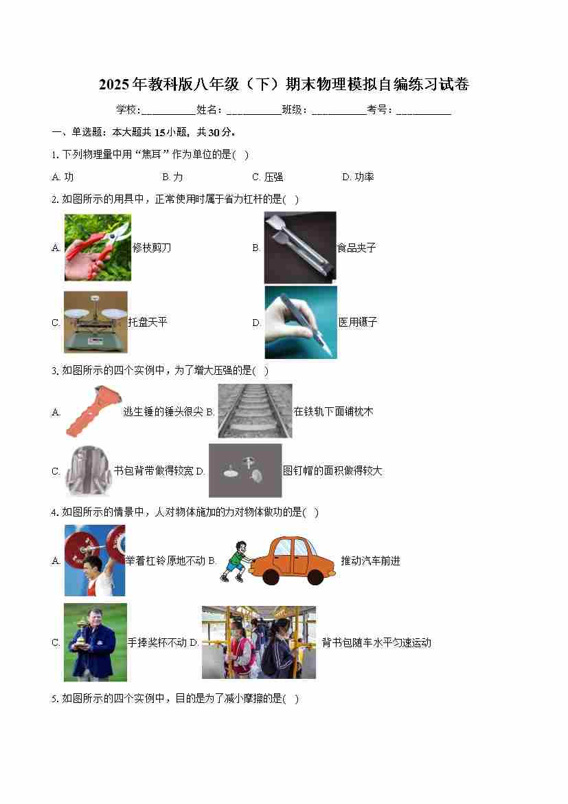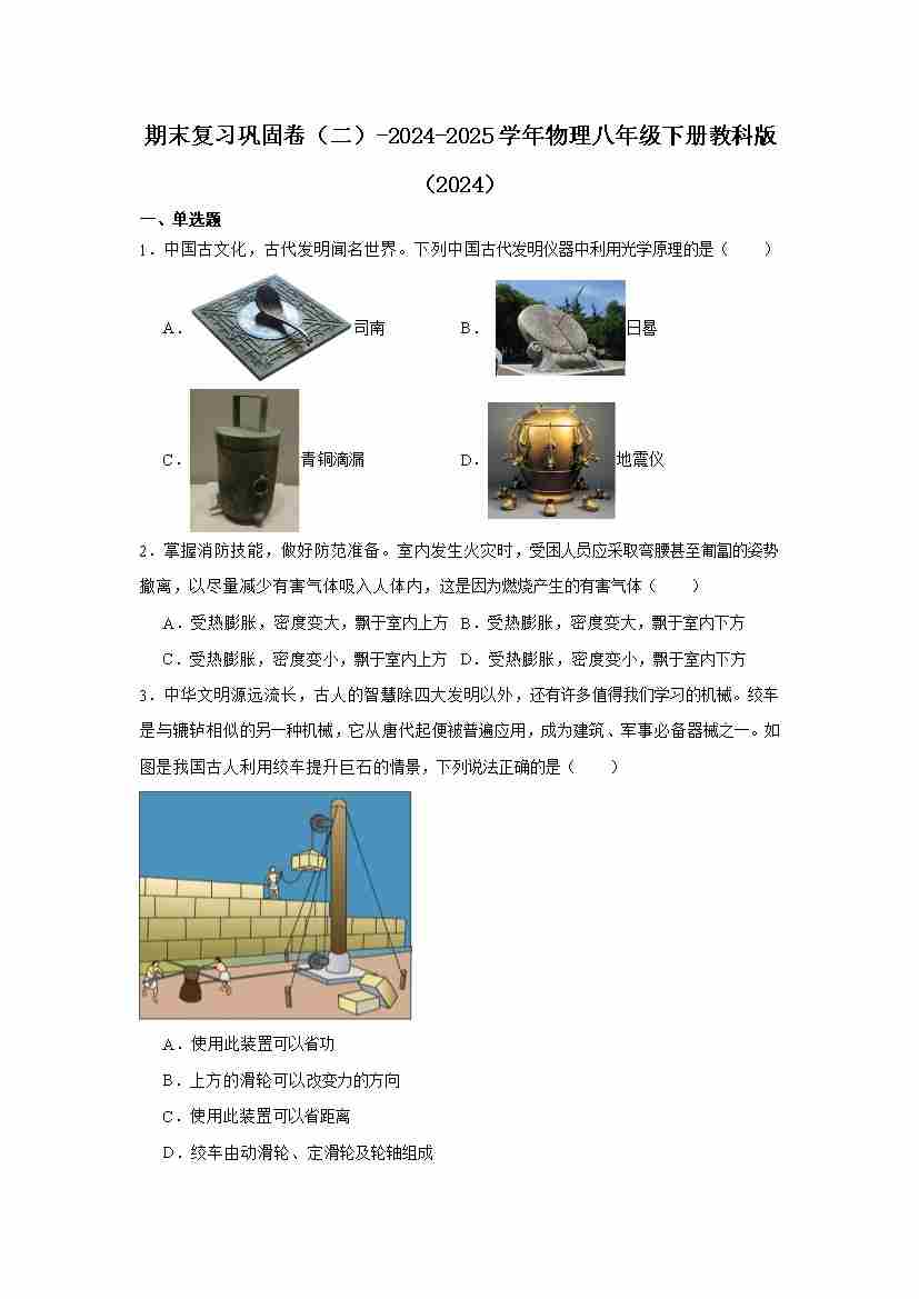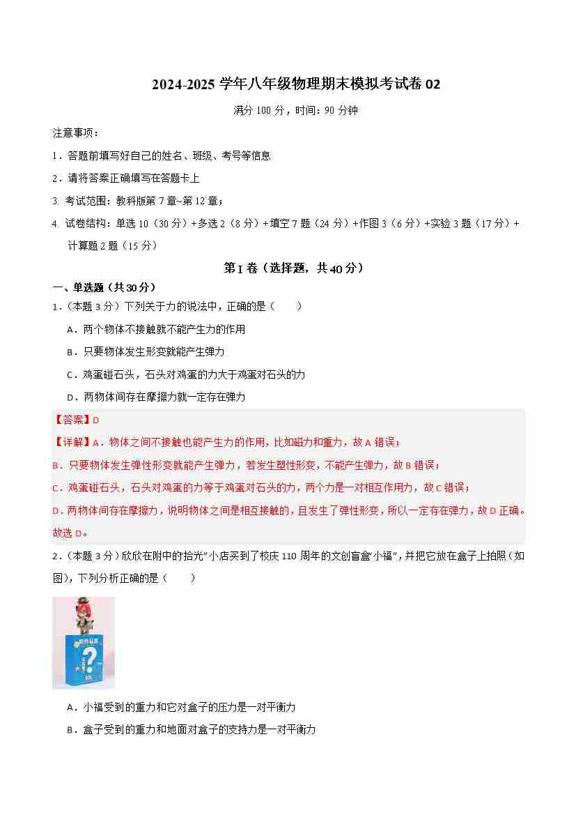 期末复习巩固卷(二)-物理八年级下册教科版(2024)