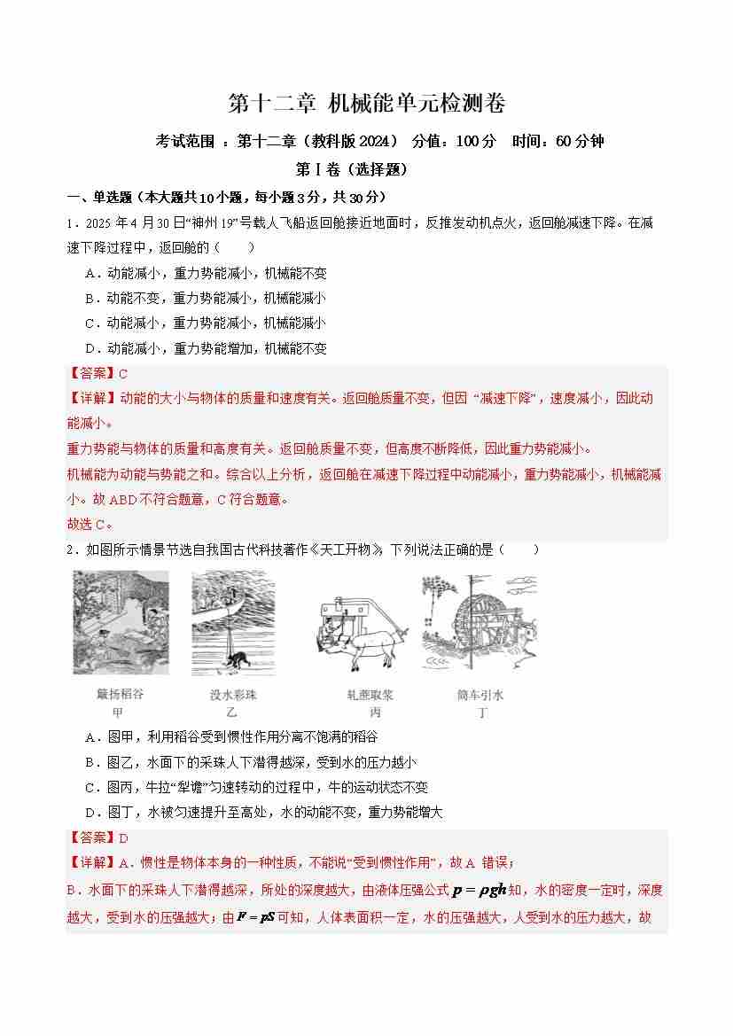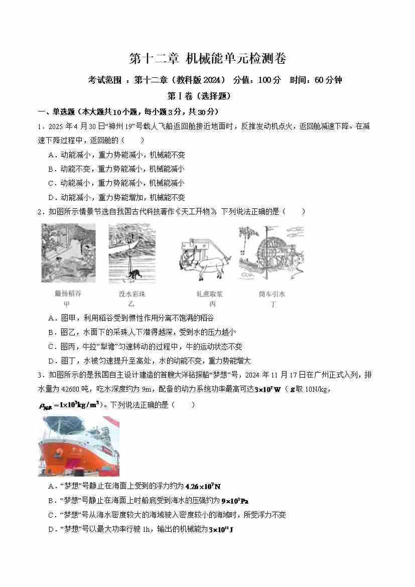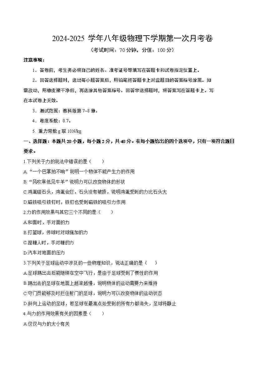 八年级物理第一次月考卷【测试范围:教科版2024,7~8章】(考试版)(教科版)